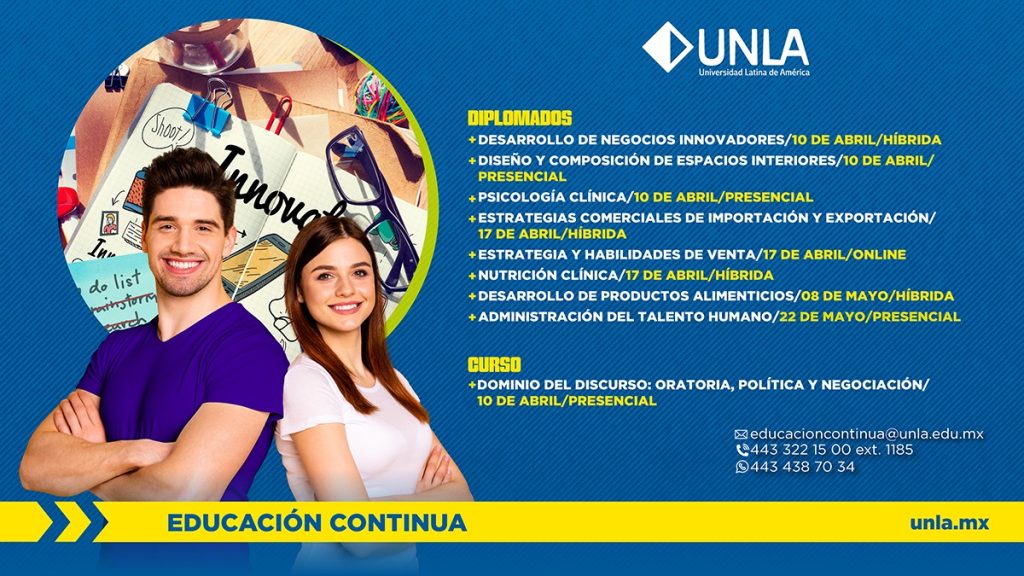 Redacción / La Voz de Michoacán Morelia, Michoacán. - En un entorno laboral cada vez más competitivo y dinámico, la actualización constante se ha convertido en una necesidad para profesionistas y organizaciones que buscan mantenerse vigentes y generar impacto. Con esta visión, la Universidad Latina de América (UNLA) fortalece su oferta de Educación Continua, diseñada para impulsar la especialización, profesionalización y desarrollo de habilidades clave en distintos sectores. A través de programas ejecutivos de alto nivel y cursos de corta duración, la UNLA brinda alternativas flexibles que se adaptan al ritmo de vida de profesionistas y público en general. Su enfoque práctico permite que las y los participantes adquieran herramientas aplicables de manera inmediata en su ámbito laboral, fortaleciendo su perfil sin dejar de lado sus actividades diarias. Diseñada en respuesta a las necesidades actuales del mercado, esta propuesta integra opciones de formación en distintos campos del conocimiento: Cursos: Dominio del Discurso: Oratoria, Política y Negociación Diplomados: Administración del Talento Humano Desarrollo de Negocios Innovadores Desarrollo de Productos Alimenticios Diseño y Composición de Espacios Interiores Estrategia y Habilidades de Ventas Estrategias Comerciales de Importación y Exportación Nutrición Clínica Psicología Clínica Impartidos durante todo el año, los programas incorporan modelos de enseñanza innovadores que favorecen el aprendizaje dinámico, la interacción con especialistas y el desarrollo de competencias específicas en periodos accesibles. Da el siguiente paso en tu desarrollo profesional y encuentra el programa ideal para ti en Educación Continua UNLA. Para más información envíanos un Whatsapp al 443 438 7034 o un correo a educacioncontinua@unla.edu.mx