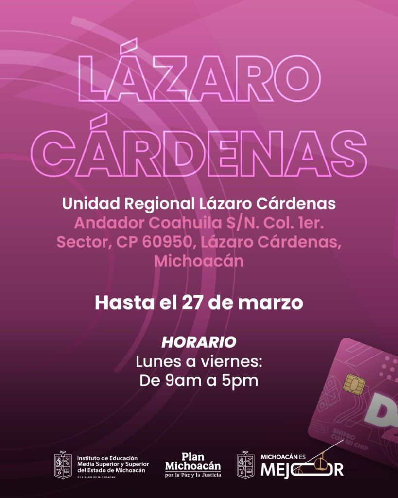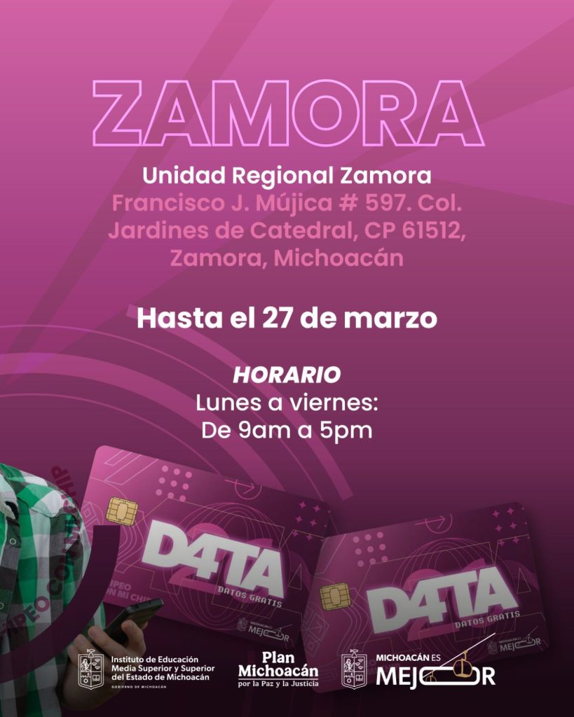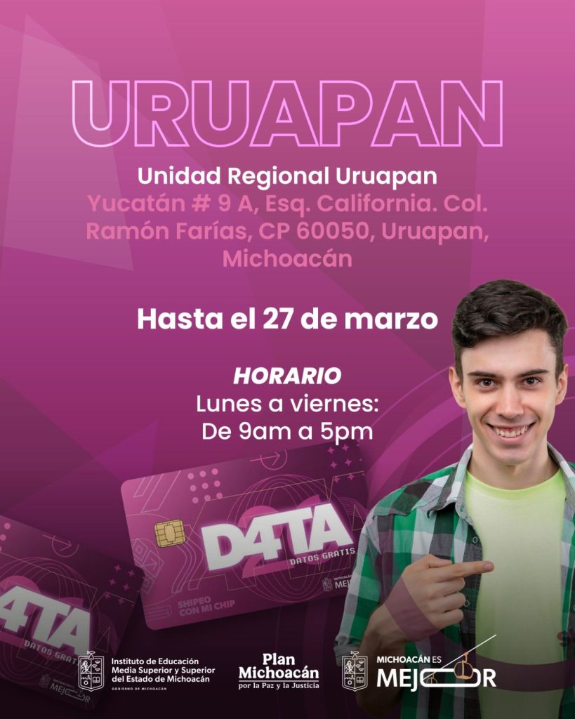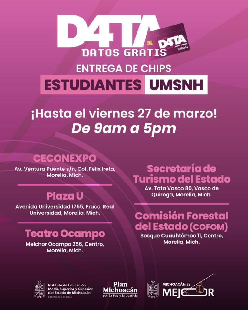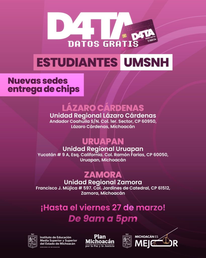 Redacción / La Voz de Michoacán Morelia, Michoacán. Para acercar los beneficios del Programa D4TA Datos Gratis a todas las regiones del estado, el Instituto de Educación Media Superior y Superior del Estado (Iemsysem) invita a estudiantes de la Universidad Michoacana de San Nicolás de Hidalgo (UMSNH) a conocer y acudir a las sedes habilitadas en el interior del estado para recoger y activar su chip con internet gratuito. Estas sedes ahora permitirán a las y los jóvenes nicolaitas de Lázaro Cárdenas, Uruapan y Zamora realizar el trámite de manera ágil y cercana, sin necesidad de trasladarse a la capital, facilitando así su acceso a herramientas digitales para el desarrollo académico. A través de las Unidades Regionales de la Secretaría de Educación del Estado (SEE) podrán recoger su chip hasta el viernes 27 de marzo, en un horario de 09:00 a 17:00 horas. En Lázaro Cárdenas, la unidad se ubica en Andador Coahuila S/N, colonia 1er Sector. En Uruapan, en la calle Yucatán 9 A, esquina California, colonia Ramón Farías. Mientras que en Zamora, el punto de atención se encuentra en Francisco J. Mújica 597, colonia Jardines de Catedral. Asimismo, en Morelia, los centros de entrega ubicados en Ceconexpo, Secretaría de Turismo (Sectur), Comisión Forestal del Estado (Cofom), Plaza U y Teatro Ocampo continúan operando hasta el viernes 27 de marzo, en un horario de 09:00 a 17:00 horas. Las y los estudiantes deben presentar original y copia de INE, CURP y comprobante de inscripción, credencial de estudiante o carga de materias (portal SIIA). En el caso de menores de edad, deberán acudir acompañados de su padre, madre o tutor, con la documentación correspondiente del beneficiario y de su acompañante.