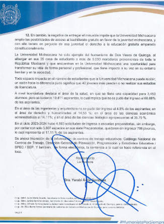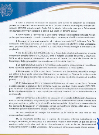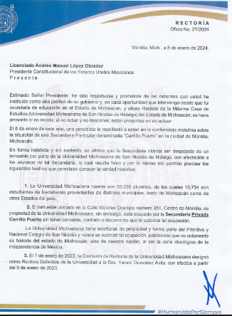 Redacción / La Voz de Michoacán Morelia, Michoacán. La rectora de la Universidad Michoacana de San Nicolás de Hidalgo (UMSNH), Yarabí Ávila González, declaró en una carta dirigida al presidente de México Andrés Manuel López Obrador, que la pregunta que le fue realizada en la mañanera respecto al desalojo de la Escuela Secundaria Popular Felipe Carrillo Puerto fue hecha “en forma indebida y sin sustento”. La rectora informó que ayer mismo se pospuso el desalojo del alumnado, los trabajadores y los maestros de las instalaciones de la escuela secundaria popular y se programó la entrega del inmueble para finales del ciclo escolar 2023-2024. “El 8 de enero la Universidad Michoacana informó a la Juez Sexto Civil que decidió postergar la ejecución de la sentencia hasta que concluya el ciclo escolar 2023-2024 para no afectar la educación de los alumnos y dar tiempo suficiente para que las autoridades de la Secundaria encuentren un nuevo espacio”, precisó la rectora nicolaita. Esto sucedió a raíz de que el conflicto escalara hasta que el presidente López Obrador, quien comentó en su conferencia de prensa matutina estar enterado acerca de la problemática. Durante la mañanera del día de ayer, la reportera Sandra Aguilera le expuso al mandatario que “la rectora Yarabí Ávila González metió un juicio para desalojar a los estudiantes". "Este tipo de escuelas hacen falta en Michoacán, pues se corre mucho peligro de que estudiantes sean atraídos por el crimen organizado, es mejor que tengan dónde estudiar y ocuparse", agregó la periodista respecto a la escuela comunitaria sostenida con base en los pagos voluntarios que realizan las familias hacia el personal de la escuela popular. Ante esta cuestión, el presidente respondió que se encontraba al tanto de la situación y que lo comentaría con la secretaria de Educación, Leticia Ramírez. “Es una escuela que lleva por nombre Felipe Carrillo Puerto, sí ya leí la denuncia y que tiene un vínculo con la universidad nicolaita en Michoacán, lo vamos a ver con Lety Ramírez”, declaró. En ese contexto , Ávila González resaltó que la UMSNH dio espacio para que concluyeran el ciclo escolar y que se trataba de una escuela privada que ocupaba el inmueble sin derecho alguno. “La Universidad Michoacana tiene escrituras de propiedad y forma parte del Primitivo y Nacional Colegio de San Nicolás y nunca se autorizó tal ocupación, patrimonio que no solamente es historia del estado de Michoacán, sino de nuestra nación”, añadió en el documento dirigido al presidente. Así mismo, la rectora denunció que esta situación afectaba a los estudiantes de bachillerato nicolaitas. “La negativa de entregar el inmueble impide que la Universidad Michoacana amplíe las posibilidades de acceso al bachillerato gratuito en favor de la juventud michoacana”, declaró. Así, con la intervención del presidente y la falta de elementos de seguridad, el desalojo de la escuela se realizará una vez que se terminen las clases de este ciclo escolar, lo que llevará a los educadores y al alumnado a tener que buscar un nuevo espacio para dar y tomar clases.