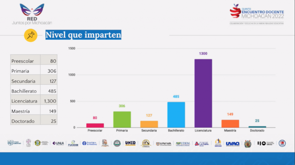 Morelia, Michoacán. El V Encuentro Docente 2022, organizado por la Red Juntos por Michoacán, obtuvo resultados positivos gracias a la participación y compromiso de más de 2 mil 400 docentes y académicos, de todos los niveles educativos de Michoacán y otros estados de la República Mexicana, así como instituciones de alcance internacional, que se registraron a los 13 webinars y conferencias magistrales realizadas vía web. Anteriormente, este Encuentro Docente estaba dirigido a la capacitación del nivel superior, sin embargo, ante las necesidades, en esta edición se amplió la oferta de talleres y capacitaciones a los niveles de básico y media superior, con el objetivo de generar estrategias y dinámicas que impulsen la calidad desde el preescolar hasta el doctorado. Por otro lado se contó con la colaboración de instituciones externas a la Red Juntos por Michoacán, de esta manera, refuerza su compromiso de generar lazos entre instituciones que compartan su visión de trabajo sobre la educación más allá de las fronteras. https://www.youtube.com/watch?v=1BzHgX2A-j8 #RedJuntosporMichoacán #VEncuentroDocente #Educación #Vinculación