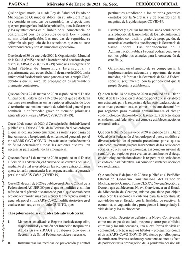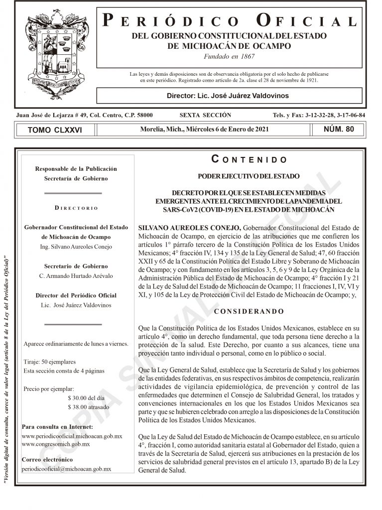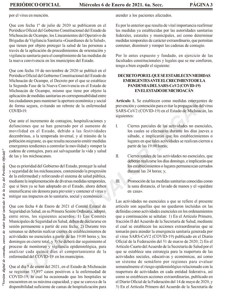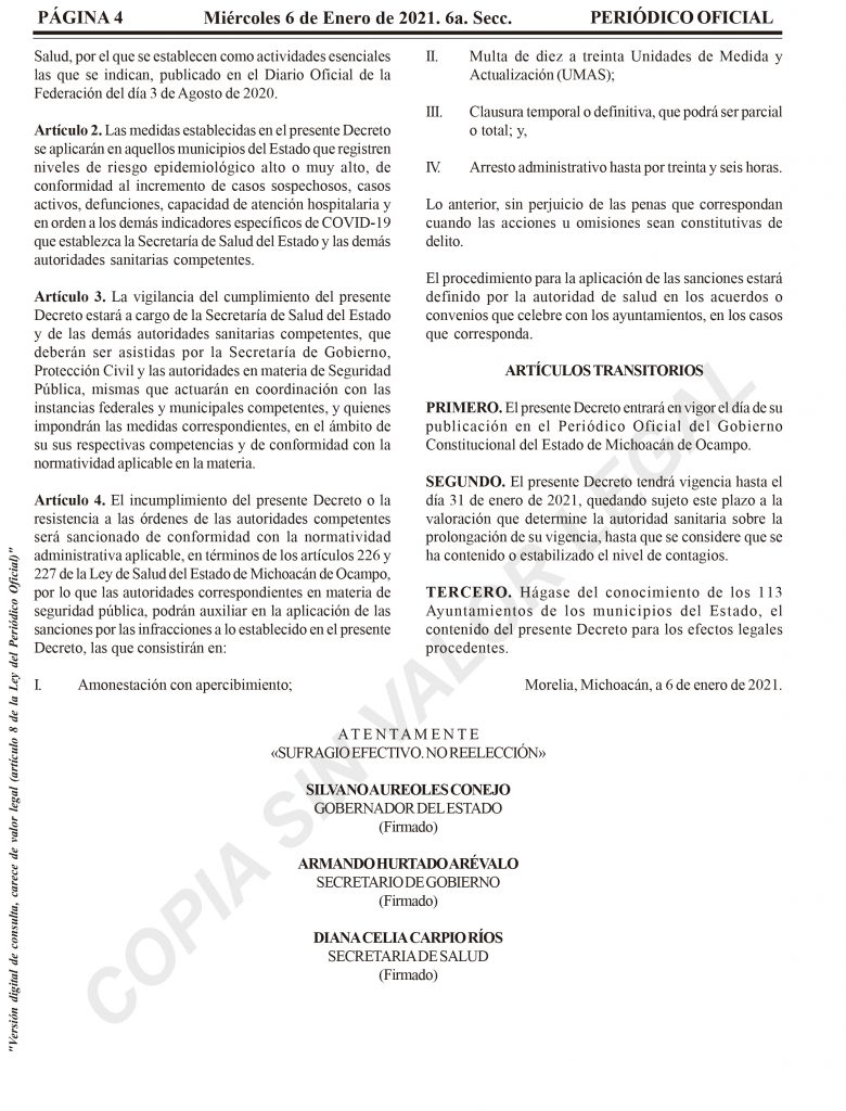 Redacción / La Voz de Michoacán Morelia, Michoacán. El Gobierno del Estado, que encabeza Silvano Aureoles Conejo, emitió el decreto mediante el cual se establecen medidas emergentes ante el crecimiento de la pandemia de COVID-19 en Michoacán. El documento, publicado en el Periódico oficial del Gobierno del Estado de Michoacán el 6 de enero del presente año, tendrá vigencia hasta el día 31 de enero de 2021, quedando sujeto a la valoración que determine la autoridad sanitaria sobre la prolongación de su vigencia, hasta que se considere que se ha contenido o estabilizado el nivel de contagios. El primer punto indica que habrá cierres parciales de las actividades no esenciales, los cuales se efectuarán durante los días jueves a sábado, e implicarán que los establecimientos o lugares en que tales actividades se realizan cierren a partir de las 19:00 horas. El segundo punto establece cierres totales de las actividades no esenciales, que deberán realizarse los días domingo, e implicarán que los establecimientos o lugares permanezcan cerrados durante las 24 horas. El tercer punto señala la promoción de las medidas sanitarias conocidas como la sana distancia, el lavado de manos y el “Quédate en casa”. Las medidas establecidas en el decreto se aplicarán en aquellos municipios del Estado que registren niveles de riesgo epidemiológico alto o muy alto, de conformidad al incremento de casos sospechosos, casos activos, defunciones, capacidad de atención hospitalaria y en orden a los demás indicadores de COVID-19 que establezca la Secretaría de Salud del Estado y las demás autoridades sanitarias competentes. En el decreto se especifica que la vigilancia del cumplimiento de los puntos estará a cargo de la Secretaría de Salud del Estado y de las demás autoridades sanitarias competentes, que deberán ser asistidas por la Secretaría de Gobierno, Protección Civil y las autoridades en materia de Seguridad Pública, mismas que actuarán en coordinación con las instancias federales y municipales competentes. El incumplimiento de las medidas será sancionado de acuerdo con la normatividad administrativa aplicable, que consistirán en: I. Amonestación con apercibimiento; II. Multa de diez a treinta Unidades de Medida y Actualización (UMAS); III. Clausura temporal o definitiva, que podrá ser parcial o total; y, IV. Arresto administrativo hasta por treinta y seis horas. Foto: Samuel Herrera Jr. Por último, el decreto establece que el procedimiento para la aplicación de las sanciones estará definido por la autoridad de salud en los acuerdos o convenios que celebre con los ayuntamientos, en los casos que corresponda. El incumplimiento del presente Decreto o la resistencia a las órdenes de las autoridades competentes será sancionado de conformidad con la normatividad administrativa aplicable, en términos de los artículos 226 y227 de la Ley de Salud del Estado de Michoacán de Ocampo, por lo que las autoridades correspondientes en materia de seguridad pública, podrán auxiliar en la aplicación de las sanciones por las infracciones a lo establecido en el presente Decreto ¿EN QUÉ CONSISTEN LAS SANCIONES? I. Amonestación con apercibimiento.II. Multa de diez a treinta Unidades de Medida yActualización (UMAS).III. Clausura temporal o definitiva, que podrá ser parcialo total.IV. Arresto administrativo hasta por treinta y seis horas. Lo anterior, sin perjuicio de las penas que correspondancuando las acciones u omisiones sean constitutivas dedelito. El procedimiento para la aplicación de las sanciones estarádefinido por la autoridad de salud en los acuerdos oconvenios que celebre con los ayuntamientos, en los casos que corresponda.