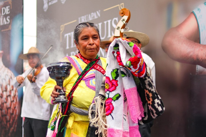 Zitácuaro.- En la comunidad de Cresencio Morales, municipio de Zitácuaro, se borda y se teje la vestimenta mazahua. La portadora de tradición Beatriz Guzmán Catarino es una actual precursora de estos usos ancestrales que promueve entre las juventudes de su pueblo que desean casarse. "Me siento orgullosa de portar este traje que se usa durante las bodas de mi comunidad", comparte mientras muestra los regalos destinados para el futuro matrimonio: un gabán para el novio y una larga servilleta bordada en punto de cruz color blanca con dibujos de colores para la novia. Beatriz también viste su indumentaria tal como la usaría durante las nupcias: una falda elaborada de manera artesanal, una faja de lana de borrego, huaraches, un rebozo y un morral bordado de diferentes colores. Comenta que los regalos para el matrimonio se hacen en este pueblo de manera artesanal o maquina de coser, con telas brocadas e hilos. Ya listo el ropaje, se usa un sahumerio con copal para recibir a la pareja durante la boda. Orgullosa de su tradición, la portadora llama a las juventudes de su comunidad a conservar el uso de esta indumentaria ancestral, y señaló "que no se pierda la tradición, que se siga usando porque es bonito, ¡Que viva Cresencio Morales!”.