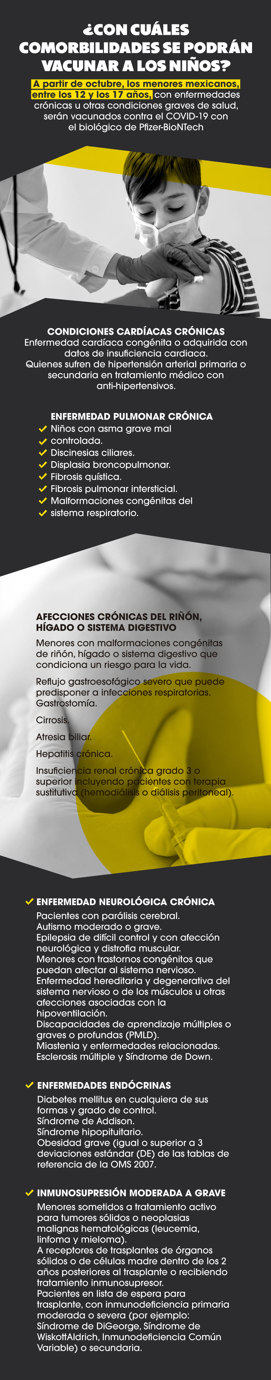 Redacción / La Voz de Michoacán Morelia, Michoacán. Este miércoles 17 de noviembre se estará aplicando la segunda dosis contra la COVID-19 a menores de 12 a 17 años con alguna comorbilidad y embarazadas, para así completar su esquema de vacunación con Pfizer. En Morelia, con un horario de 8 de la mañana a 14 horas se estará aplicando la segunda dosis en el IMSS e ISSSTE y de 9 de la mañana a 3 de la tarde en el Hospital Infantil. En La Piedad se estará aplicando la segunda dosis en el Hospital General de La Piedad, en la calle España 400 de la colonia Europea, con un horario de 8 de la mañana a 14 horas. Desde las 8 de la mañana y hasta las 14 horas, también con Pfizer y segunda dosis, en Uruapan en el Hospital General “Dr Pedro Daniel Martínez”, ubicado en el kilómetro 1.5 de la carretera a Tejerías, Uruapan. Estas son las enfermedades o factores de riesgo que serán tomados en cuenta 1- Condiciones cardíacas crónicas2- Enfermedad pulmonar crónica3- Afecciones crónicas del riñón, hígado o sistema digestivo4- Enfermedad neurológica crónica5- Enfermedades endocrinas6- Inmunosupresión moderada a grave7- Asplenia o disfunción del bazo y enfermedades hematológicas8- Anomalías genéticas graves que afectan a varios sistemas9- Embarazo adolescente