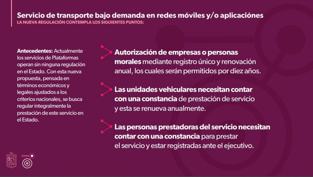 "Con la ley ya se regulariza, ya es legal, ya está normado en Michoacán, las plataformas, ya estaban a nivel federal, ya pagaban impuestos y reconocidos, aquí en Michoacán había una resistencia media arcaica, allá de la época de las cavernas, que no tenía lógica porque era algo que ya existía pero no normado, ahora ya esta regularizado el tema de las plataformas a beneficio de todos".