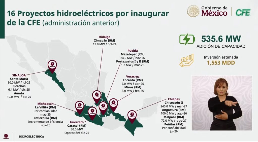 Redacción / La Voz de Michoacán Morelia, Michoacán. Este 2025, el Gobierno de México concluye los proyectos de modernización y repotenciación en las presas La Villita e Infiernillo, en la entidad michoacana. La mañana de este miércoles, durante la conferencia matutina de la presidenta de México, Claudia Sheinbaum Pardo, llevada a cabo en Querétaro, Emilia Esther Calleja Alor, directora general de la Comisión Federal de Electricidad (CFE), detalló el conjunto de 16 proyectos hidroeléctricos, entre los que se encuentran los dos embalses michoacanos. Indicó que se tiene contemplado que en mayo de 2025 se entreguen los trabajos realizados en La Villita y en noviembre los de Infiernillo -sobre esta última presa tienen que ver con el incremento de eficiencia-. En su conjunto, las 16 obras en diversos lugares del país tienen inversión estimada de mil 553 millones de dólares, con una adición de capacidad de 535.6 megawatts (MW). Calleja Alor destacó que en estos proyectos se obtuvo la visión de capacidad de eficientar el proceso, no por utilizar una mayor cantidad de agua, ya que se están utilizando las mismas presas, la misma infraestructura, únicamente es incrementando eficiencia. Los demás estados en los que interviene el gobierno mexicano con ogras hidroeléctricas son Sinaloa, Guerrero, Hidalgo, Puebla, Veracruz y Chiapas.