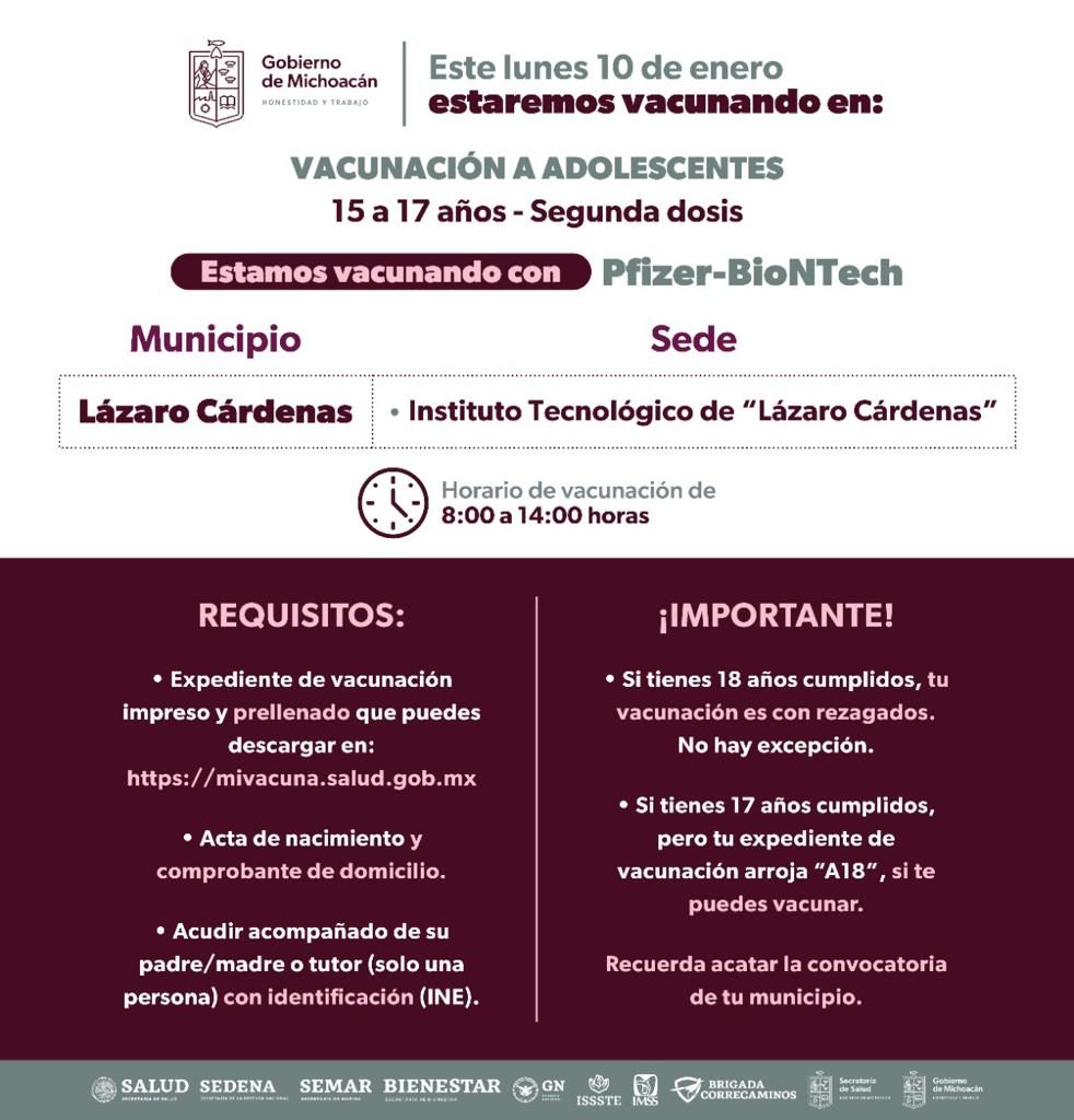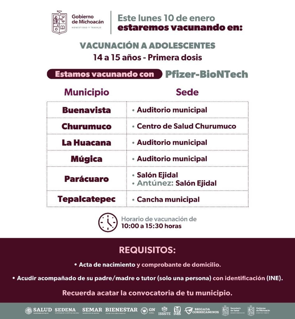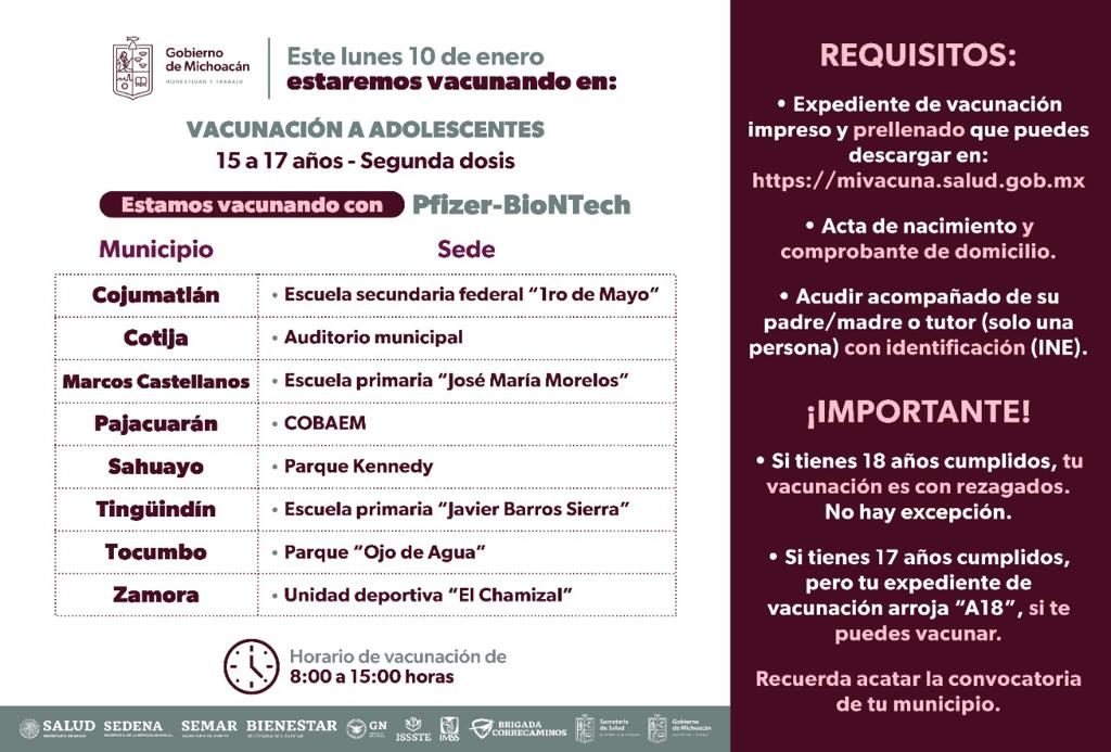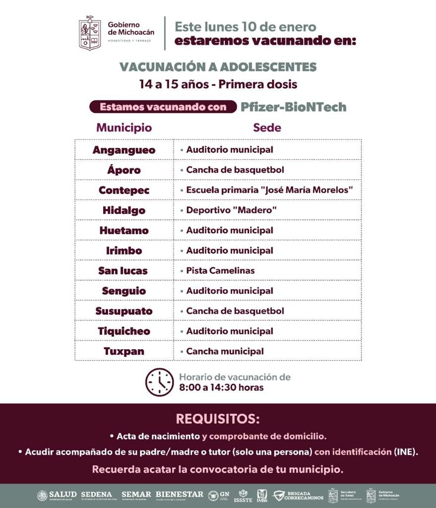 Redacción / La Voz de Michoacán Morelia, Michoacán.- Este lunes continúa la vacunación en distintos municipios para menores de edad, tanto para primera y segunda dosis en los siguientes municipios: