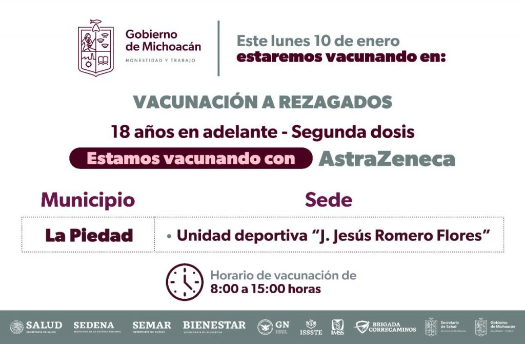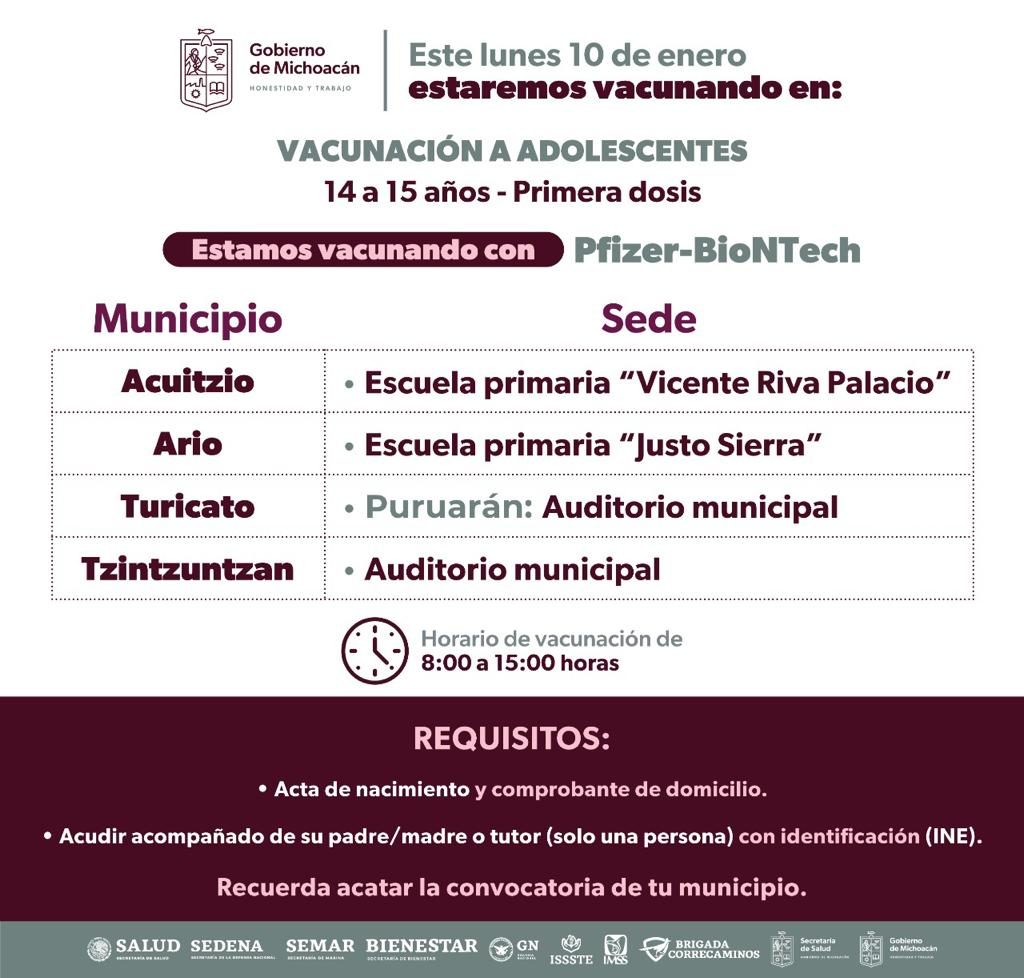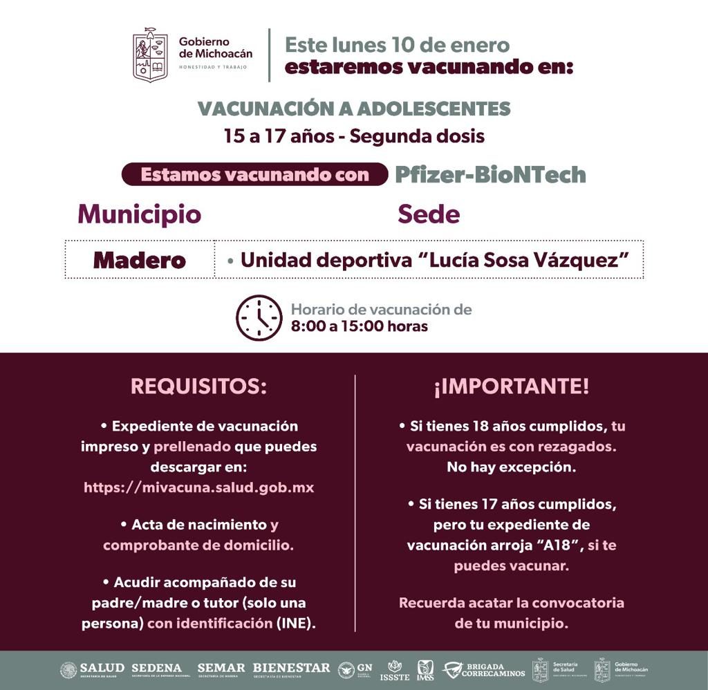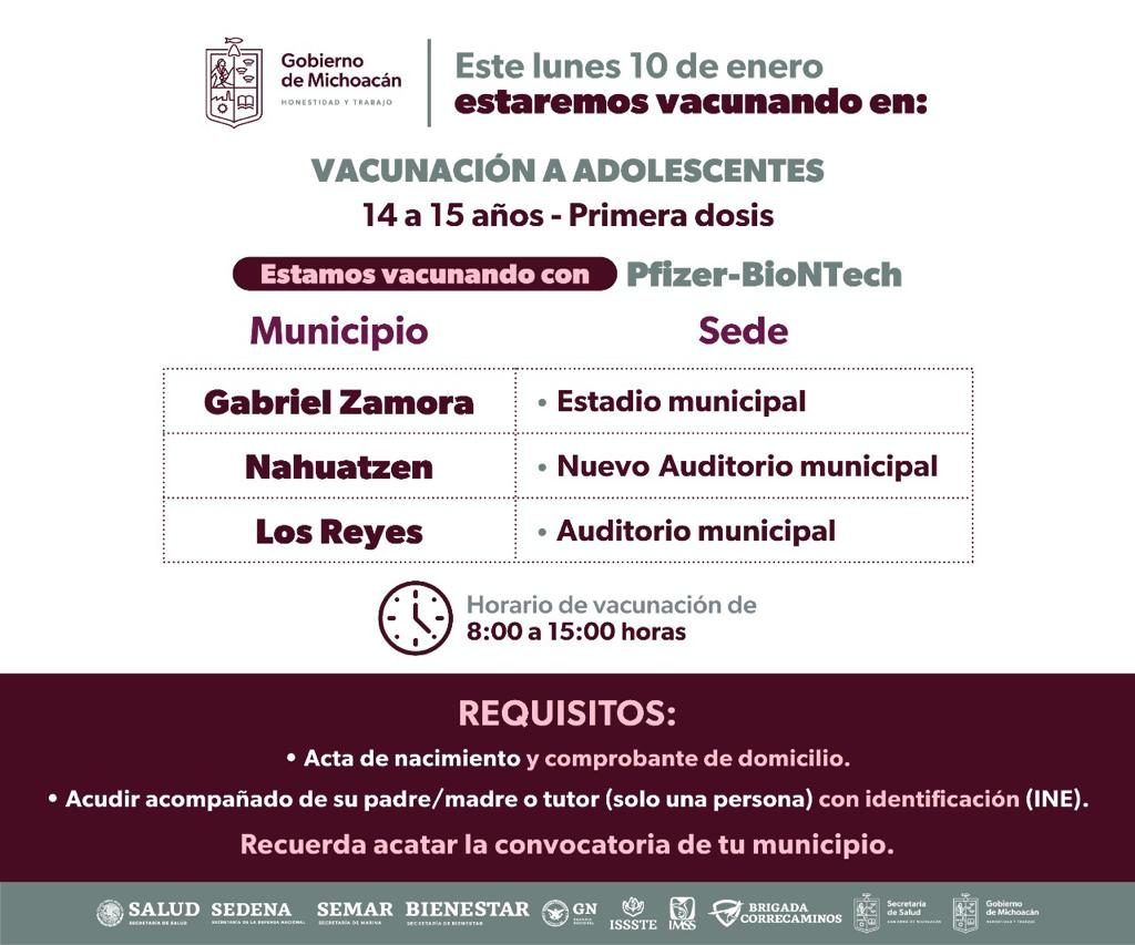 Redacción / La Voz de Michoacán Morelia, Michoacán.- Este lunes continúa la vacunación en distintos municipios para menores de edad, tanto para primera y segunda dosis en los siguientes municipios: