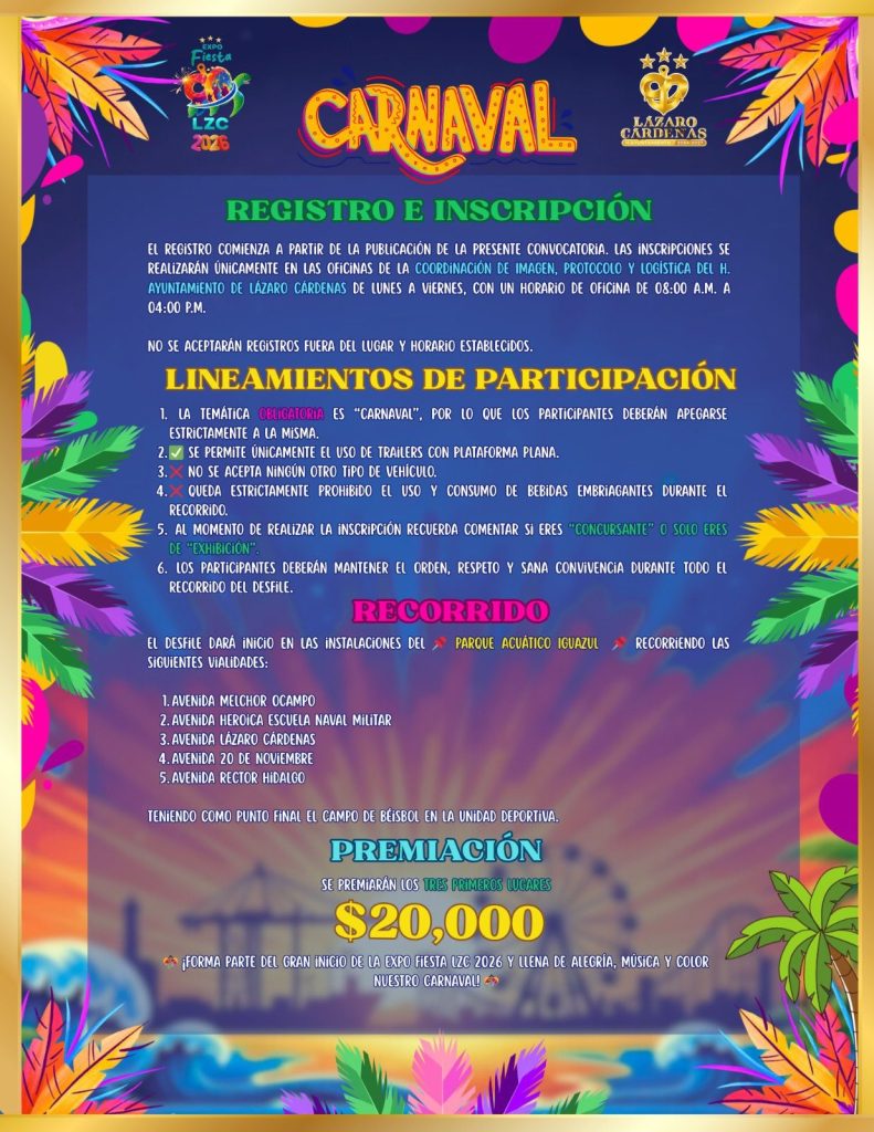 Lázaro Cárdenas, Michoacán. El Gobierno Municipal de Lázaro Cárdenas invita a la ciudadanía, instituciones educativas, empresas, asociaciones y público en general a participar en el gran Desfile de Carnaval, evento que forma parte del arranque de la Expo Fiesta LZC 2026, una celebración que busca fortalecer la convivencia familiar, promover la cultura y consolidar la identidad festiva del municipio.