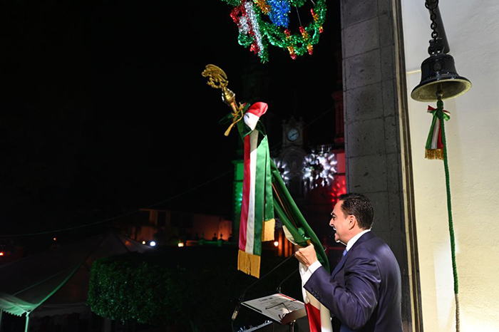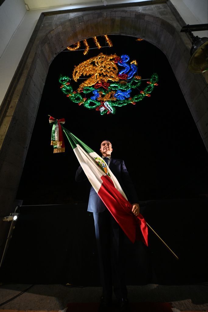 Una vez tomada la bandera el presidente dio el Grito de Independencia tocando la campana en honor, indicando el inicio de la lucha de Independencia de México, acto seguido efectuó los vítores a los héroes que nos dieron patria y libertad y ondeo la bandera, siguiendo con la entonación del Himno Nacional Mexicano, para concluir con un espectáculo de iluminación y sonido piro musical.