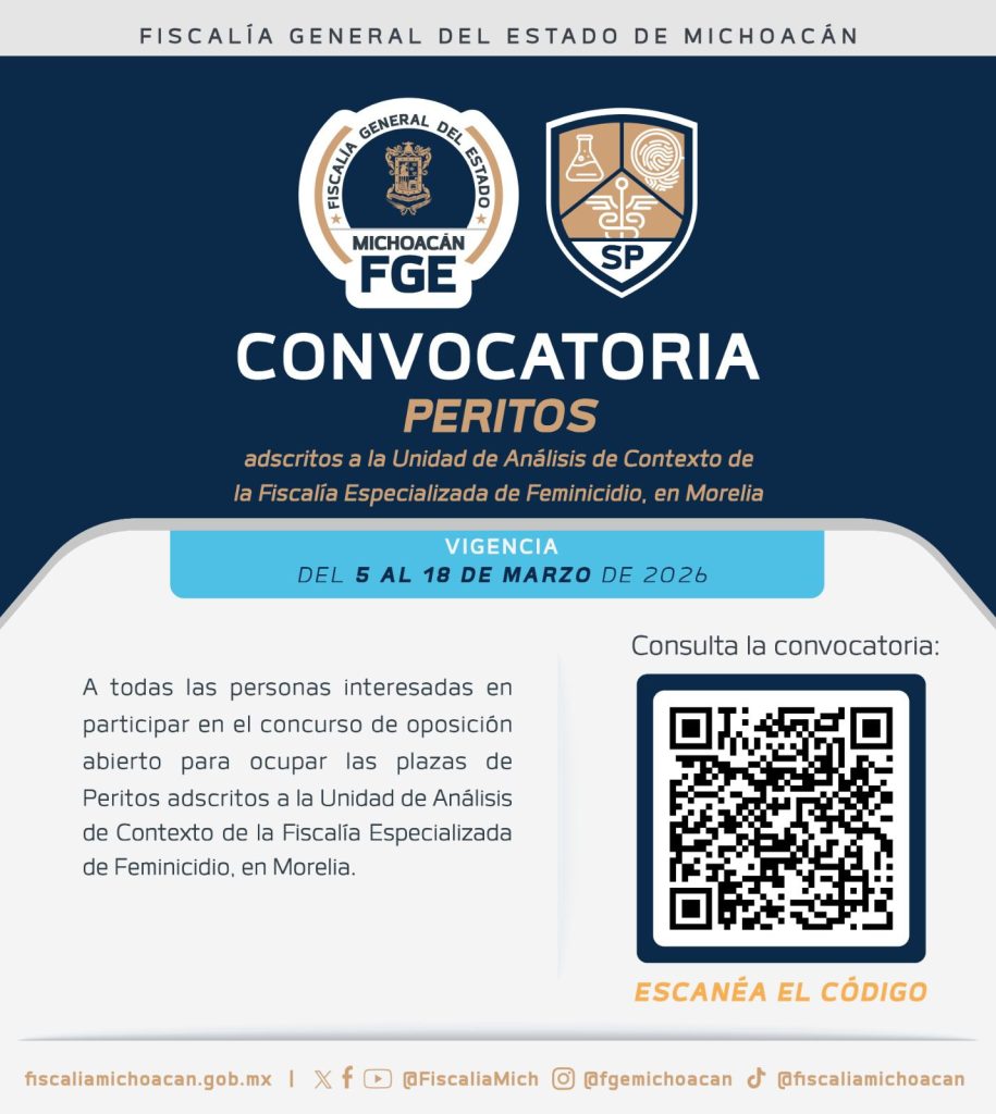 Redacción / La Voz de Michoacán Morelia, Michoacán. - Con el compromiso de fortalecer las investigaciones con perspectiva de género y consolidar equipos técnicos altamente especializados, la Fiscalía General del Estado de Michoacán (FGE) emitió este día la convocatoria para ocupar siete plazas de Perito, adscritas a la Unidad de Análisis de Contexto de la Fiscalía Especializada de Feminicidio. “Para la integración de los nuevos perfiles será indispensable que las personas aspirantes acrediten conocimientos en materia de perspectiva de género, así como plena disposición para capacitarse y aplicar este enfoque en su actuación pericial, en atención a la naturaleza de las investigaciones relacionadas con feminicidio y violencia contra las mujeres”, señaló el Fiscal General del Estado, Carlos Torres Piña. Las plazas disponibles corresponden a las siguientes áreas especializadas: Antropología Social; Análisis de Información Estadística y Georreferenciación; Criminología; Criminalística; Psicología Forense; Trabajo Social; y Victimología, disciplinas fundamentales para el análisis integral de los contextos en los que se cometen delitos en razón de género. Entre los requisitos establecidos se encuentran contar con título y cédula profesional afines a la especialidad; cursar y aprobar la Formación Inicial de Perito con promedio mínimo de 8.0; aprobar las evaluaciones de control de confianza o contar con evaluaciones vigentes, además de cumplir con los demás lineamientos señalados en la convocatoria. La documentación requerida incluye constancia que acredite contar con conocimientos en perspectiva de género; solicitud y carta de exposición de motivos dirigida al Fiscal General del Estado; cartilla liberada del Servicio Militar (en el caso de hombres); constancia de no antecedentes penales; constancias de no inhabilitación expedidas por la Secretaría de Contraloría del Ejecutivo del Estado y por el Órgano Interno de Control de la Fiscalía General del Estado, entre otros documentos. Las personas interesadas deberán enviar su documentación completa en formato PDF a través del apartado “Concurso de Oposición”, disponible desde la fecha de publicación de la convocatoria y hasta el 18 de marzo del presente año, en el siguiente enlace institucional:https://www.fiscaliamichoacan.gob.mx/convocatorias_y_consultas Con el objetivo de garantizar un proceso imparcial, transparente y sustentado en criterios objetivos, se integra una Comisión de Evaluación conformada por representantes de la Fiscalía General del Estado; la Vicefiscalía de Inteligencia e Investigación Criminal; el Instituto de Capacitación y Servicio Profesional de Carrera; la Dirección General de Administración; y la Dirección General Jurídica y de Derechos Humanos, con la participación del Órgano Interno de Control como comisario, así como de una Comisión Especial para Entrevistas. Las evaluaciones contempladas serán: entrevista ante la Comisión Especial; evaluación curricular; examen escrito de conocimientos generales en principios de actuación pericial y en la materia de especialización; valoración médica; y evaluación psicológica. Todas se aplicarán en el Instituto de Capacitación y Servicio Profesional de Carrera de la Fiscalía General del Estado, ubicado en Periférico Paseo de la República #5000, esquina con la calle Declaración de Independencia, colonia Sentimientos de la Nación, C.P. 58170, Morelia, Michoacán, teléfono (443) 3-53-27-84.