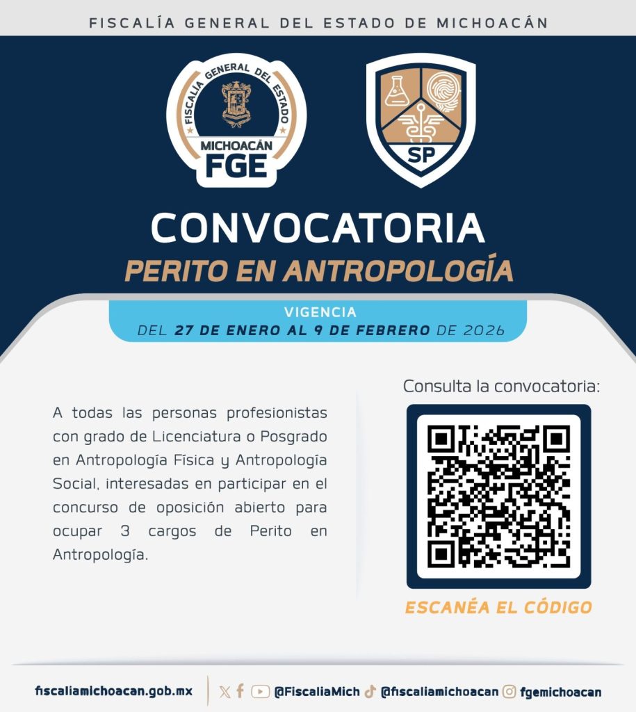 Morelia, Michoacán. La Fiscalía General del Estado de Michoacán (FGE) emitió una convocatoria dirigida a personas profesionistas con grado de Licenciatura o Posgrado en Antropología Física y Antropología Social, interesadas en participar en el concurso de oposición abierto para ocupar tres cargos de Perito en Antropología en esta institución.