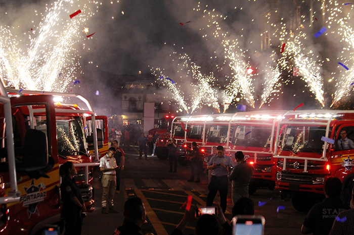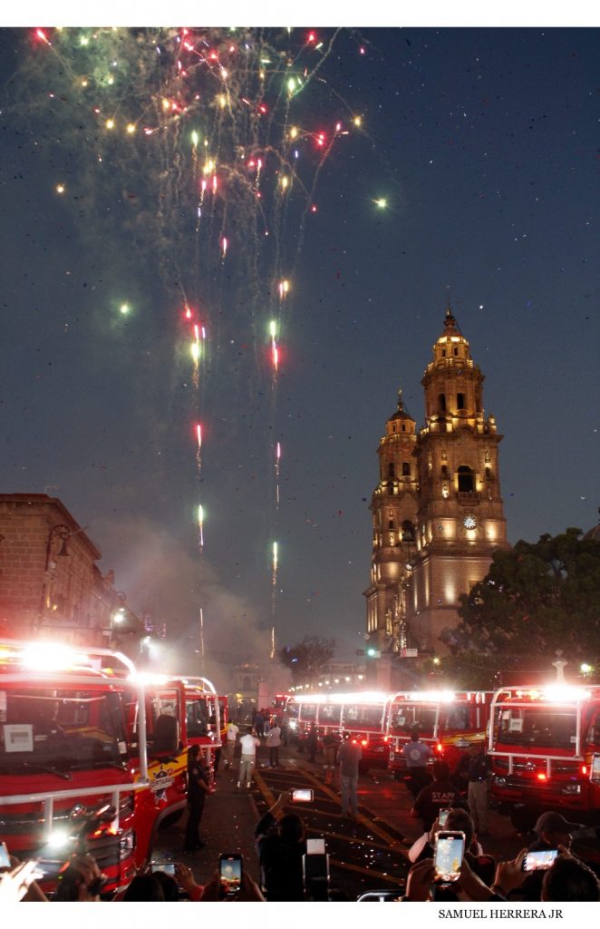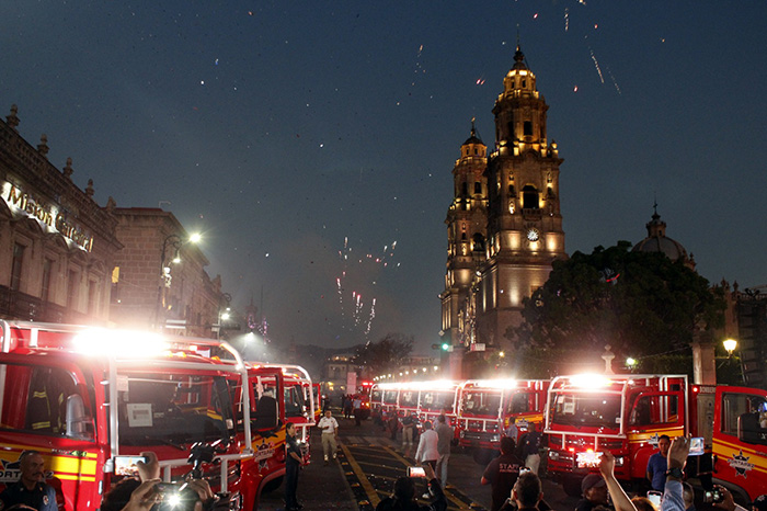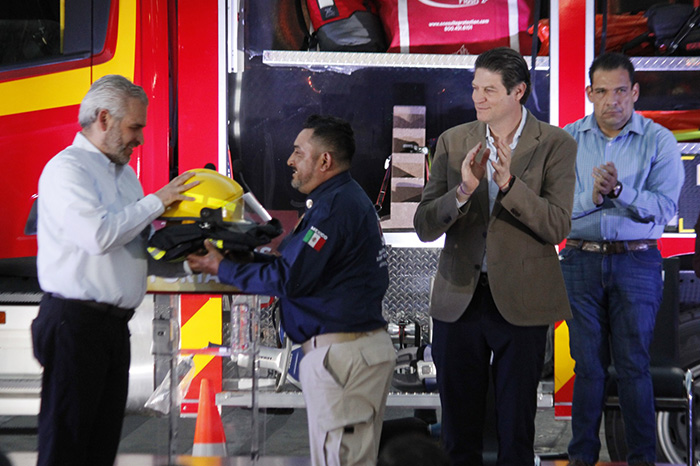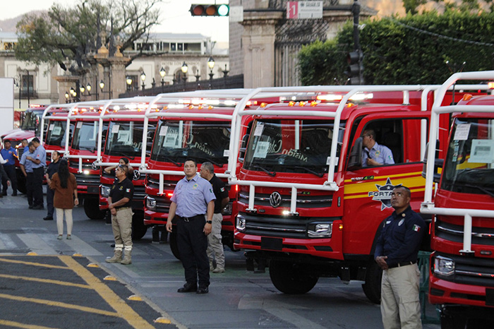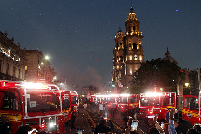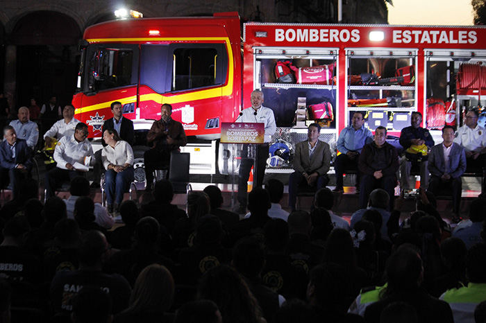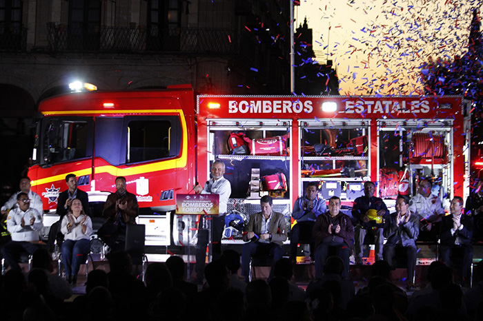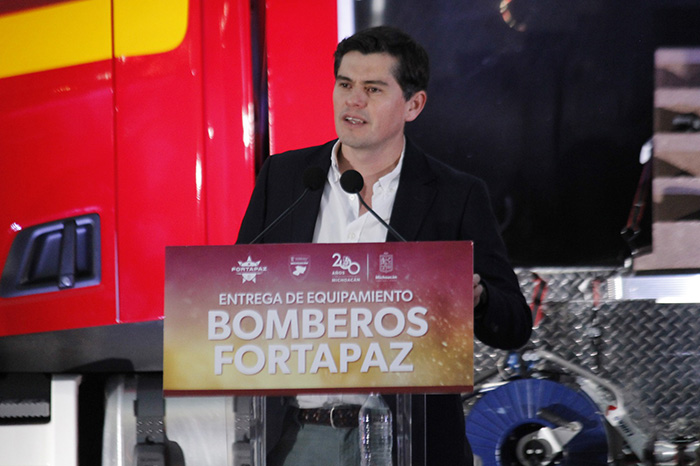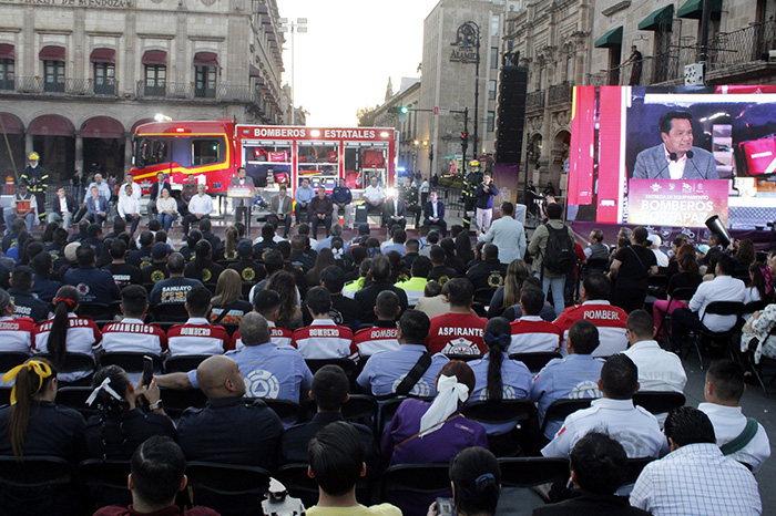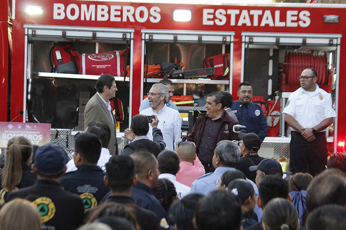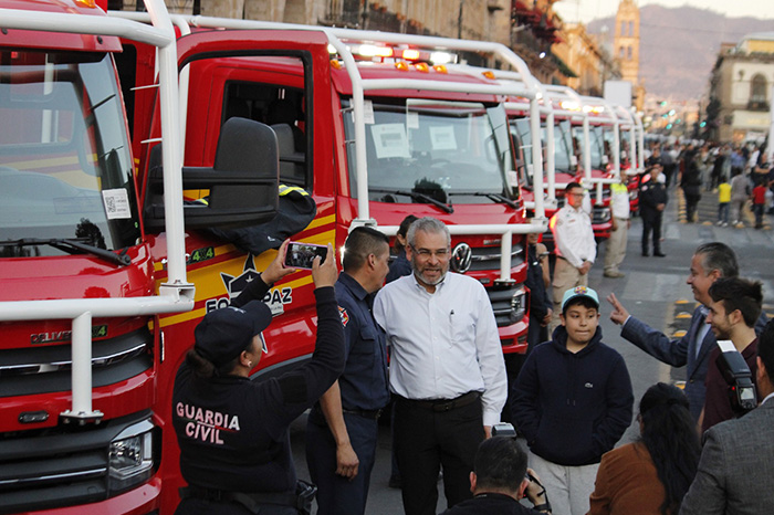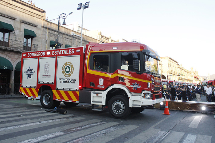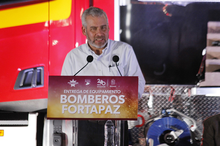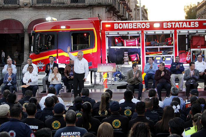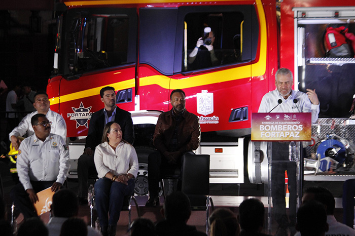 Redacción / La Voz de Michoacán Morelia, Michoacán. El gobernador Alfredo Ramírez Bedolla realizó una entrega histórica de equipamiento para 11 corporaciones de bomberos municipales y de la Coordinación de Protección Civil Estatal, valuado en más de 142 millones de pesos, a fin de fortalecer la capacidad de respuesta para la atención a incendios y siniestros. El mandatario detalló que es la primera vez que un Gobierno estatal asigna recursos de manera específica para apoyar a los bomberos de los municipios y del estado, al tratarse de equipo nuevo y de buena calidad para brindar un mejor servicio en caso de emergencias. Manifestó que de esta manera se refrenda la vocación municipalista por parte del Gobierno de Michoacán, al entregar este apoyo a las corporaciones de bomberos de las principales ciudades de la entidad, quienes son la primera respuesta ante cualquier situación de riesgo. César Erwin Sánchez Coria, titular del Secretariado Ejecutivo del Sistema Estatal de Seguridad Pública. Foto, Samuel Herrera Jr. En tanto, el titular del Secretariado Ejecutivo del Sistema Estatal de Seguridad Pública (SESESP), César Erwin Sánchez Coria detalló que a través del Fondo para el Fortalecimiento para la Paz (Fortapaz) 2023 se entregan 21 vehículos, 224 trajes, 11 equipos hidráulicos, 172 equipos de respiración automática, 465 herramientas diversas y equipo de infraestructura. Explicó que los 11 municipios beneficiados como La Piedad, Lázaro Cárdenas, Los Reyes, Morelia, Pátzcuaro, Sahuayo, Tacámbaro, Tarímbaro, Uruapan, Zamora y Zitácuaro, así como la Coordinación de Protección Civil Estatal, ahora podrán salvaguardar de una mejor manera la integridad de las y los michoacanos, ya que este equipo es vital para el desarrollo de sus funciones. Asistieron al evento la presidenta honoraria del Patronato del Sistema DIF Michoacán, Grisel Tello Pimentel; los secretarios de Gobierno, Elías Ibarra Torres y de Finanzas y Administración, Luis Navarro; así como alcaldes de los 11 municipios beneficiados.