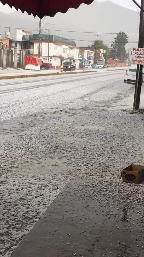 Paracho, Michoacán. A través de redes sociales, poblanos del municipio de Paracho, han compartido imágenes de las calles en diversos puntos de la entidad repletas de granizo.