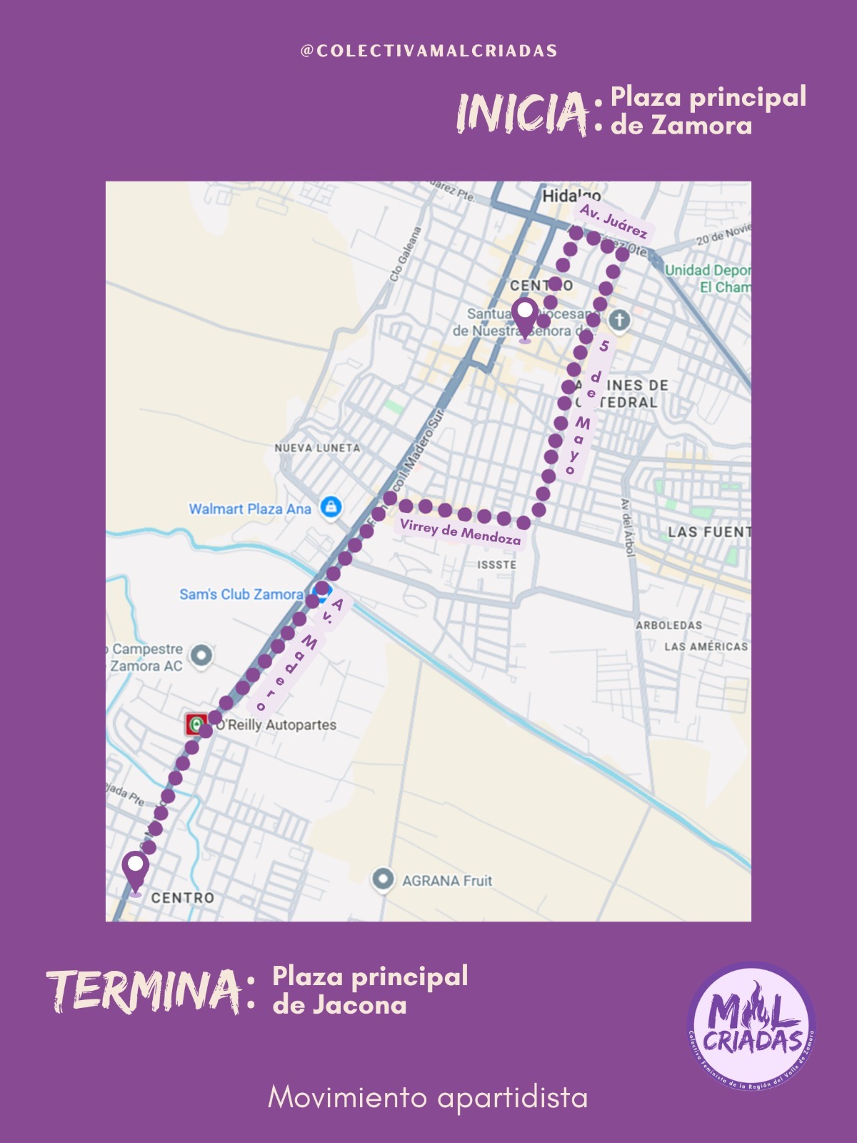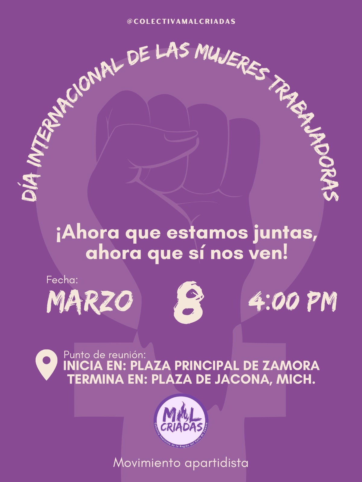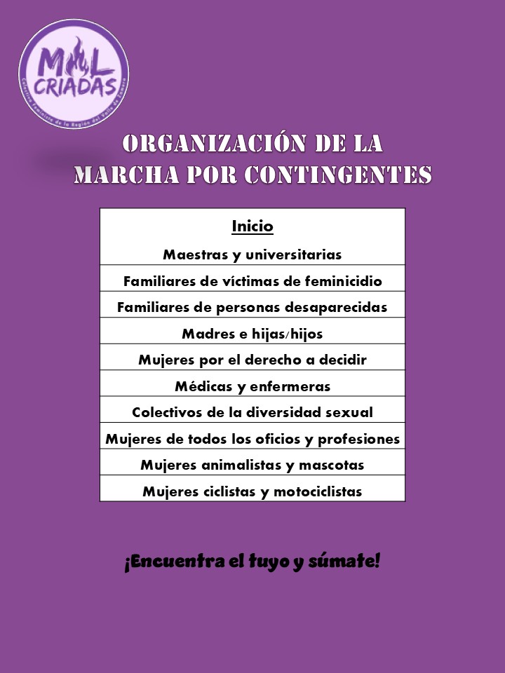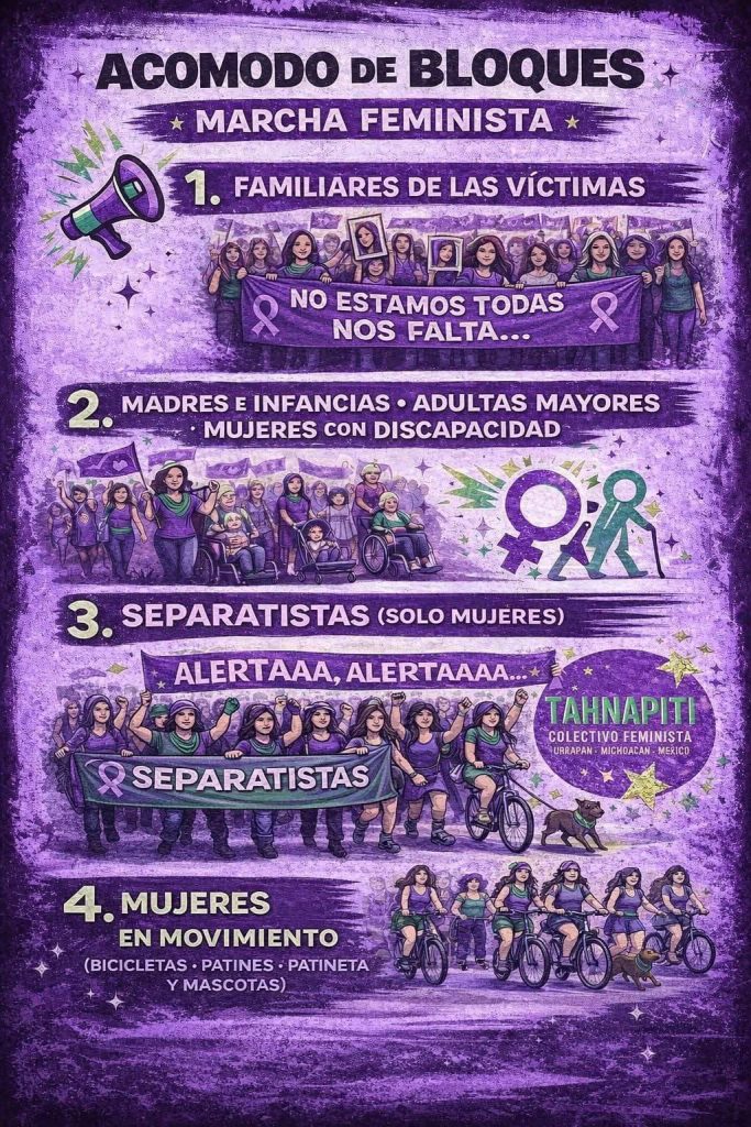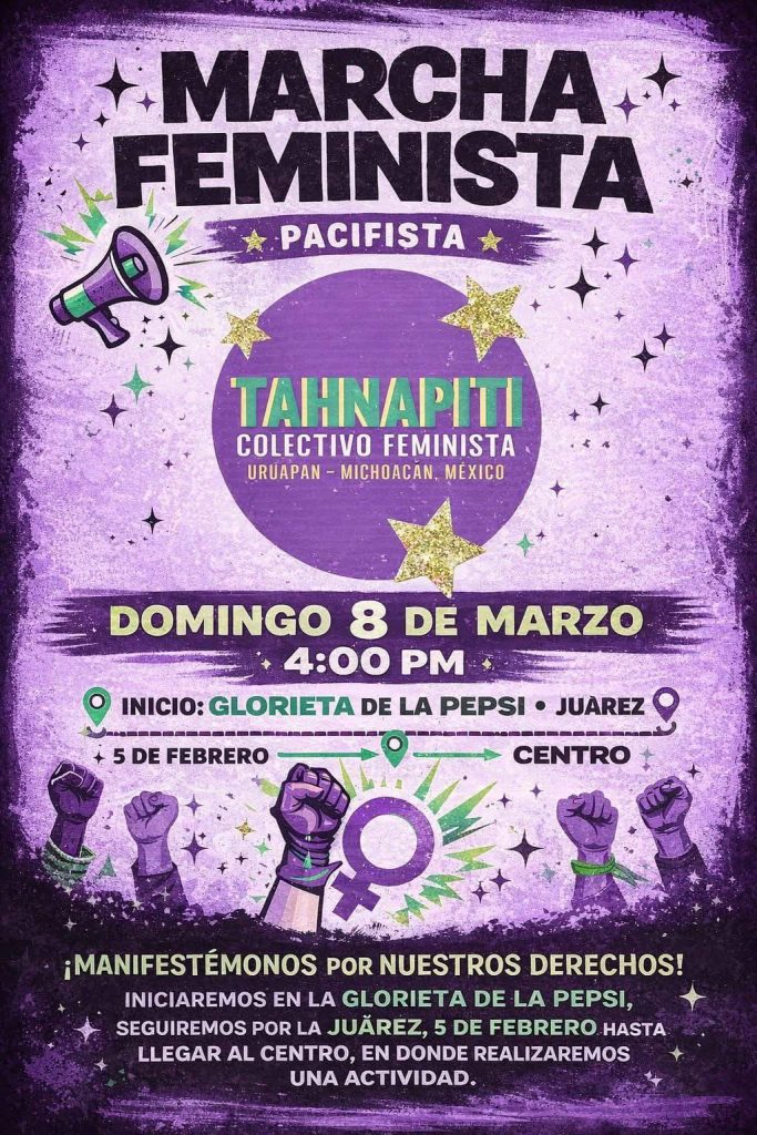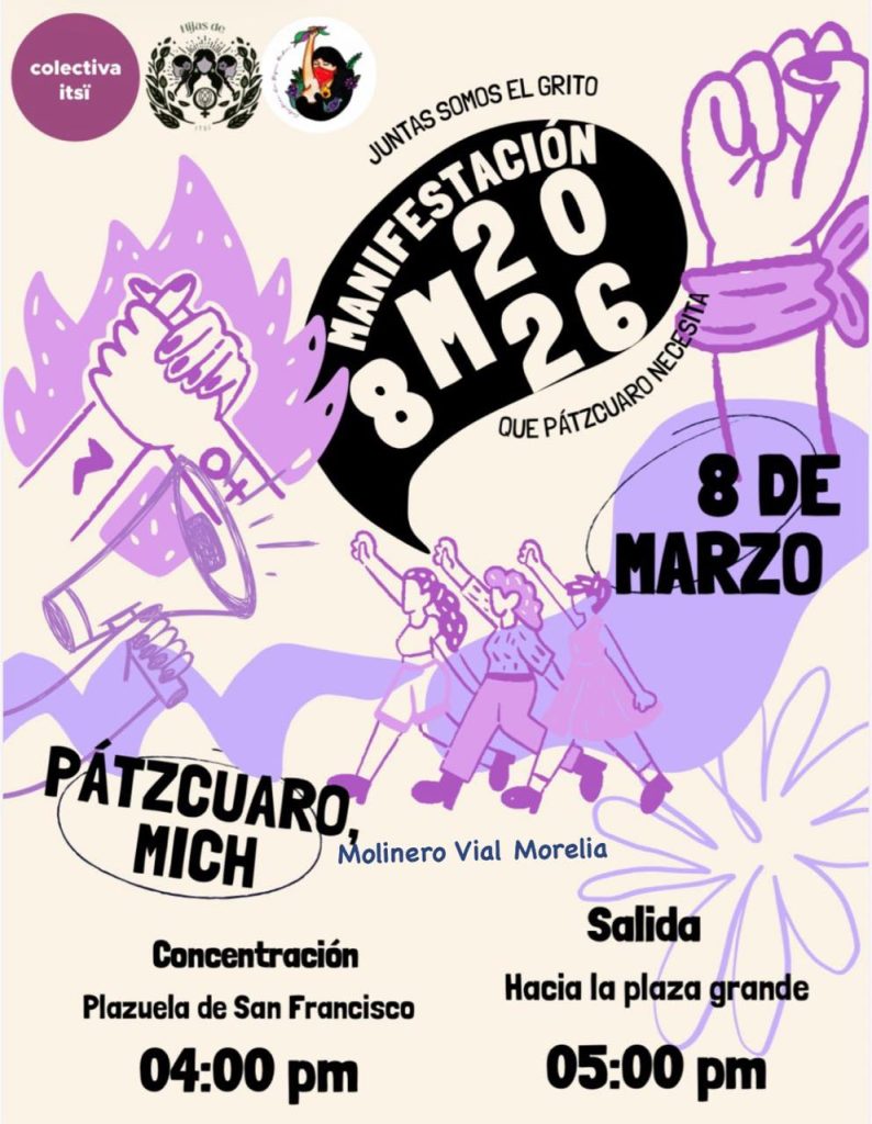 Ashley Rodríguez / La Voz de Michoacán Morelia, Michoacán. - Este 8 de marzo, Día Internacional de la Mujer, michoacanas saldrán a manifestarse en diversos puntos del estado en contra de la violencia de género y la desigualdad, así como para exigir justicia por todas aquellas a las que les arrebataron la vida. Hasta el momento se han dado a conocer convocatorias realizadas por colectivos feministas de Morelia, Pátzcuaro, Uruapan, Zamora y Zacapu. Se espera que en próximos días más municipios se sumen a la concentración del 8M. Estas movilizaciones tienen como objetivo defender los derechos de las mujeres y visibilizar la desigualdad, discriminación y agresiones que todos los días padecen las mujeres. A continuación, te brindamos los detalles de las concentraciones y medidas de seguridad: Morelia En la ciudad de Morelia, se han dado a conocer 2 convocatorias: la Marcha 8M y la Marcha Violeta, que partirán de diferentes puntos. Marcha 8M El domingo 8 de marzo de 2026 a las 16:00 horas se realizará la marcha con motivo del Día Internacional de las Mujeres Trabajadoras, teniendo como punto de reunión el Monumento a Lázaro Cárdenas, en la ciudad de Morelia. La movilización conmemora una década de organización y protesta feminista en el estado y es convocada por colectivas y organizaciones de carácter autónoma. La marcha es organizada por la Asamblea de Mujeres Michoacán, las Indómitas Organización de Izquierda Anticapitalista, Colectiva Feminista MAPAS, Red Asaleas, Sección XVIII Snte-Cnte Poder de Base "Prensa y Propaganda", Colectiva Sïkuame y la Colectivx Zapatista La Oveja Roja. En su posicionamiento se definen como "anticapitalistas, antipatriarcales, antiracistas, anticapacitistas, transincluyentes, antimilitaristas, antiespecistas" y subrayan que se trata de un espacio autónomo, libre de partidos políticos e instituciones del estado. Las colectivas convocantes invitan a las asistentes a sumarse llevando pancartas, pañuelos y objetos sonoros, como parte de la expresión colectiva en las calles. Marcha Violeta Por su parte, El Frente Violeta Michoacán convocó a participar en la Marcha Violeta con motivo del Día Internacional de la Mujer, la cual se llevará a cabo el domingo 8 de marzo, a partir de las 16:00 horas, en la ciudad de Morelia. La movilización tendrá como punto de inicio la Plaza del Caballito, avanzará por la Calzada Fray Antonio de San Miguel, continuará por el Acueducto, realizará una parada en la Antimonumenta y concluirá en el Palacio de Gobierno. Bajo la consigna "Por las que ya no están, por las que seguimos y por las que vendrán", la convocatoria busca honrar la memoria de las víctimas de violencia, así como exigir condiciones de vida dignas y seguras para las mujeres y niñas. El acomodo de contingentes será el siguiente: - Contingente separatista: Calzada Fray Antonio de San Miguel. - Mujeres embarazadas, con discapacidad e infancias: Zona del Acueducto. - Contingente de víctimas: Plaza del Caballito. Asimismo, se recomendó llevar cartulinas, pancartas de exigencias, polvos holi, cacerolas, sartenes, así como el celular con suficiente carga para acompañar de manera segura y organizada la manifestación. Pátzcuaro La colectiva Itsï, a través de sus redes sociales, dio a conocer la convocatoria para la manifestación 8M 2026, bajo el lema "Juntas somos el grito que Pátzcuaro necesita". De acuerdo con el flyer, la concentración se llevará a cabo en la Plazuela de San Francisco a las 4:00 de la tarde. La salida se realizará una hora después, con rumbo a la Plaza Grande. Uruapan En Uruapan, el colectivo feminista Tahnapiti hace un llamado a manifestarse por los derechos de manera pacífica el domingo 8 de marzo a las 4:00 de la tarde. Mediante sus redes sociales dieron a conocer la ruta: La concentración se realizará en la Glorieta de la Pepsi, para avanzar por la Juárez, luego 5 de febrero hasta llegar al Centro, donde realizarán una actividad. En cuanto al acomodo de los bloques, será el siguiente: - Familiares de las víctimas. - Madres e infancias, adultas mayores y mujeres con discapacidad. - Separatistas (únicamente mujeres). - Mujeres en movimiento (bicicletas, patines, patineta y mascotas). Zamora Bajo el lema "¡Ahora que estamos juntas, ahora que sí nos ven!", la Colectiva Malcriadas hizo un llamado a manifestarse el 8 de marzo a las 4:00 de la tarde, en su movimiento apartidista. El punto de reunión será en la Plaza Principal de Zamora, para realizar un recorrido que culminará en la Plaza Principal de Jacona. La colectiva hace la invitación a que encuentres tu colectivo y te sumes; mismos que se acomodarán de la siguiente manera: - Maestras y universitarias. - Familiares de víctimas de feminicidio. - Familiares de personas desaparecidas. - Madres e hijas / hijos. - Mujeres por el derecho a decidir. - Médicas y enfermeras. - Colectivos de diversidad sexual. - Mujeres de todos los oficios y profesiones. - Mujeres animalistas y mascotas. - Mujeres ciclistas y motociclistas. Zacapu Municipios como Zacapu han anunciado actividades conmemorativas a través de las redes sociales de distintas colectivas, por lo que se recomienda mantenerse atentas a próximas indicaciones. Medidas de seguridad: Antes, durante y después de la Marcha 8M Finalmente, la colectiva Malcriadas publicó en redes sociales una serie de recomendaciones para antes, durante y después de la marcha, con el objetivo de que las asistentes transiten seguras y no se encuentren en situaciones de riesgo. ANTES - Hidrátate y come bien. - Identifica tu contingente / compañera que te acompañará durante el recorrido. - Si vas "sola" únete y preséntate. - Usa ropa cómoda; acompaña tu atuendo con un color morado. - Lleva agua, identificación y efectivo. - Lleva tu teléfono con batería y saldo. - Si estás interesada en intervenir con iconoclasia, cubre tu rostro y tus señas particulares: cicatrices, lunares, tatuajes, perfor