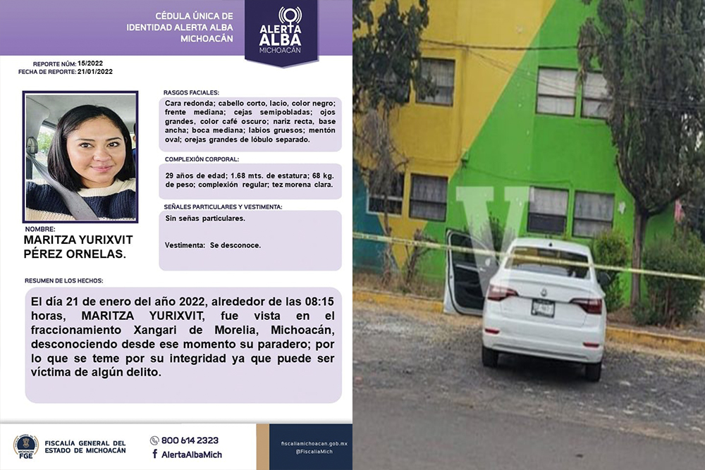 Redacción / La Voz de Michoacán Morelia, Michoacán. El pasado viernes 21 de enero sujetos desconocidos privaron de la libertad a una mujer cuando ella estaba por abordar su vehículo en un estacionamiento del fraccionamiento Xangari, ubicado en las cercanías de la carretera Morelia-Pátzcuaro, en la capital michoacana. Este hecho salió a la luz pública primero a través de las redes sociales, hasta que horas más tarde las autoridades emitieron la Alerta Alba de Maritza, por presunto secuestro, a la que dos individuos con pistola en mano subieron a la fuerza a un automóvil Polo, color gris. Horas más tarde empezó a circular la Alerta Alba de Maritza, que se presume estaría ligada a este caso de secuestro ya que fue vista por última vez en el lugar de los hechos. En la Alerta difundida aparece el nombre de Maritza Yurixvit Pérez Ornelas, de 29 años de edad, quien fue vista por última vez el día 21 de enero del año 2022, alrededor de las 08:15 horas, en el fraccionamiento Xangari de Morelia, Michoacán. En la ficha no se menciona la vestimenta que usaba la mujer al momento de su desaparición, pero sí se detallan los rasgos faciales de la fémina. Según la ficha, Pérez Ornelas tiene cara redonda, cabello corto lacio, color negro; frente mediana, cejas simipobladas, ojos grandes color café oscuro; nariz recta, base ancha, labios gruesos, mentón oval y orejas grandes de lóbulo separado. A través de la redes sociales los usuarios se empezaron a movilizar compartiendo fotos de la joven mujer. ¿Me ayudan a compartir?RT por favor, desapareció en el fraccionamiento Xangari en #Morelia se la llevó un auto Polo Gris trae una sudadera guinda 1.75 de estatura, tez morena, cabello negro corto. #NiUnaMenos #NosFaltaMaritza pic.twitter.com/PnmAOeExXk— ᴍᴀꜰꜰ? ?? (@_MaffMorales) January 21, 2022 Cualquier información que tengas de su paradero, puede comunicarse a la Fiscalía de Michoacán 800 614 2323.