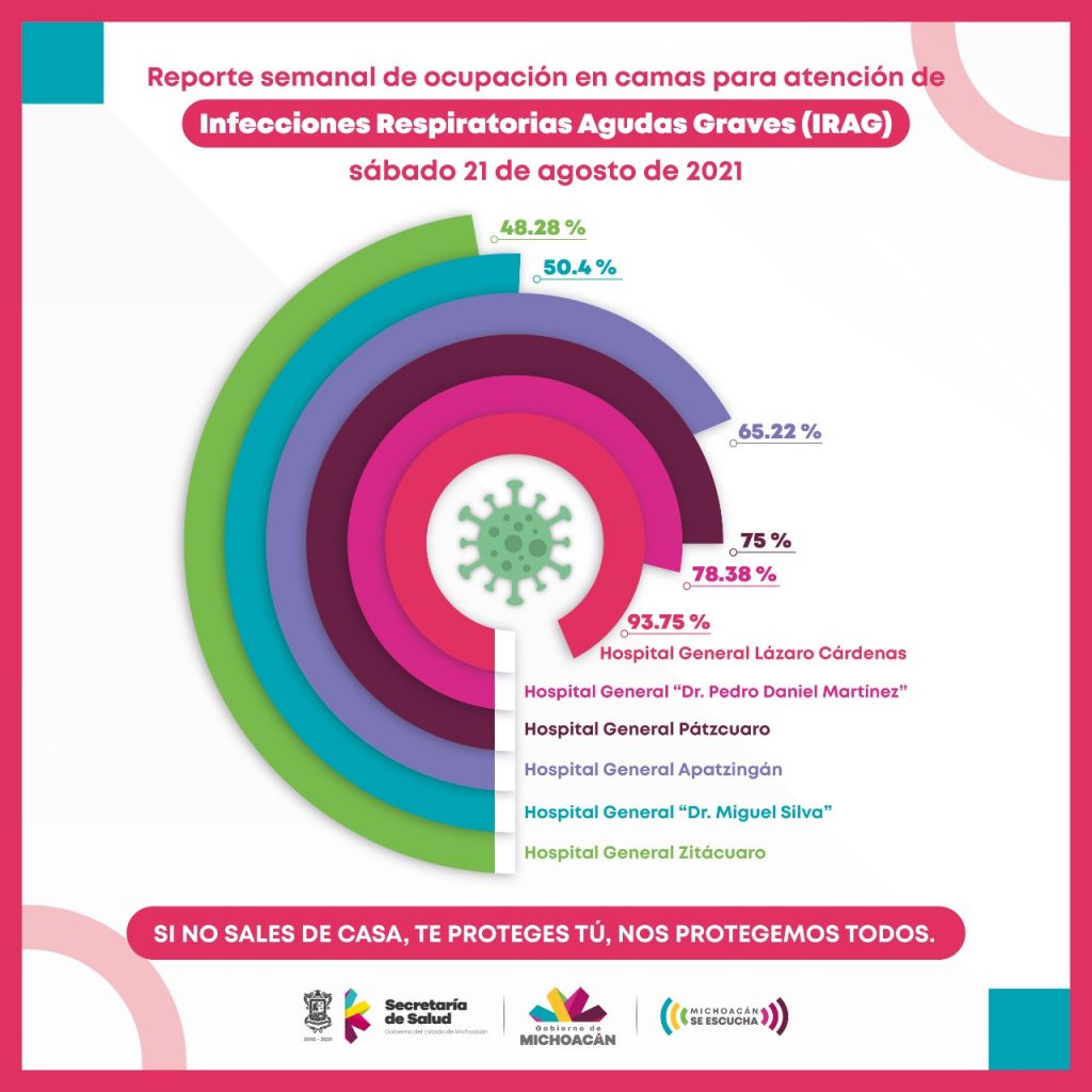 Redacción / La Voz de Michoacán Morelia, Michoacán. Unidades médicas de Lázaro Cárdenas, Uruapan, Pátzcuaro, Apatzingán, Morelia y Zitácuaro reportan una alta demanda para la atención de pacientes contagiados de COVID-19, de acuerdo con información proporcionada por la Secretaría de Salud de Michoacán. El Hospital General “Dra. Elena Avilés” de Lázaro Cárdenas encabeza la lista con la mayor atención de casos del virus SARS-CoV-2, con 93.75 de su infraestructura reconvertida para la atención de Infecciones Respiratorias Agudas Graves (IRAG). Le siguen el de Uruapan, “Dr. Pedro Daniel Martínez”, con 78.38%; mientras que la unidad de Pátzcuaro está al 75 por ciento, Apatzingán en 65.22, el Civil de Morelia en 50.4 y el de Zitácuaro en 48.28 puntos porcentuales. Al corte de este viernes 20 de agosto, Michoacán reportó 881 nuevos contagios y 51 muertes. Lázaro Cárdenas, de nueva cuenta centro de la epidemia en el territorio michoacano, agregó a su registró 204 enfermos más y 3 defunciones. El municipio del puerto michoacano notifica 2 mil 745 casos activos y 72 considerados sospechosos. Por su parte, Uruapan registró este viernes 102 contagios más y 4 muertes; reporta 972 pacientes con el virus activo y 113 sospechosos. Mientras que Morelia sumó 152 nuevos casos confirmados y 11 fallecimientos; tiene 1,019 activos y 164 sospechosos. Con un acumulado de 87 mil 820 casos confirmados y debido al repunte acelerado de positividad en la entidad, la SSM reitera el llamado a la población a reforzar las medidas sanitarias que ayuden a contener la propagación del virus, como son el uso de cubrebocas, lavado o desinfección frecuente de manos y distanciamiento social.