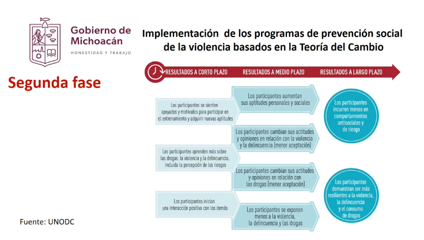 Lorena Cortés Villaseñor señaló que sus programas de prevención social de la violencia están basados en la teoría del cambio y el resultado que se busca a largo plazo es que los participantes incurran en menos comportamientos antisociales y de riesgo y que demuestren ser más resilientes a la violencia, a la delincuencia y al consumo de drogas, así como al abuso del alcohol.