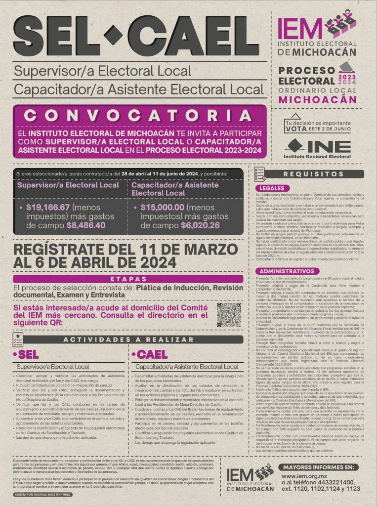 Redacción / La Voz de Michoacán Morelia, Michoacán. El Instituto Electoral de Michoacán (IEM) lanzó la convocatoria para participar como Supervisor Electoral Local o Capacitador Asistente Electoral Local en el marco de las próximas elecciones. Estos empleos tienen un sueldo de 19 mil 166 pesos y 15 mil pesos, respectivamente. El cargo de Supervisor Electoral Local consiste en coordinar las actividades de asistencia electoral, verificar la entrega de la documentación, revisar el acondicionamiento de las casillas y supervisar los procesos como conteo, sellado y agrupamiento de las boletas electorales. Por su parte, el cargo de Capacitador Asistente Electoral Local incluye las tareas de conteo, sellado y agrupamiento de las boletas electorales, así como acondicionar y equipar las casillas para la votación. El proceso de selección consta de una plática de inducción, una revisión documental, la aplicación de un examen y una entrevista. Para participar deberás presentar documentos como acta de nacimiento, credencial para votar, comprobante de domicilio, tres fotografías tamaño infantil, constancia de situación fiscal del SAT, constancia de estudios y la CURP. Todos estos documentos deberán entregarse en original y copia. Así mismo, se deberá acreditar que la persona postulante no es servidora pública, operadora de programas sociales, servidora de la nación o familiar consanguíneo o por afinidad de algún integrante o candidato del partido político o candidatura independiente registrada. Si te interesa, puedes consultar la convocatoria en el siguiente enlace, donde se explican a detalle los requisitos legales y administrativos necesarios para postularte a cualquiera de los dos cargos: https://drive.google.com/file/d/1Vz8_t5z18w3mxYSYMBXBXtHMnM0jkZ4Y/view