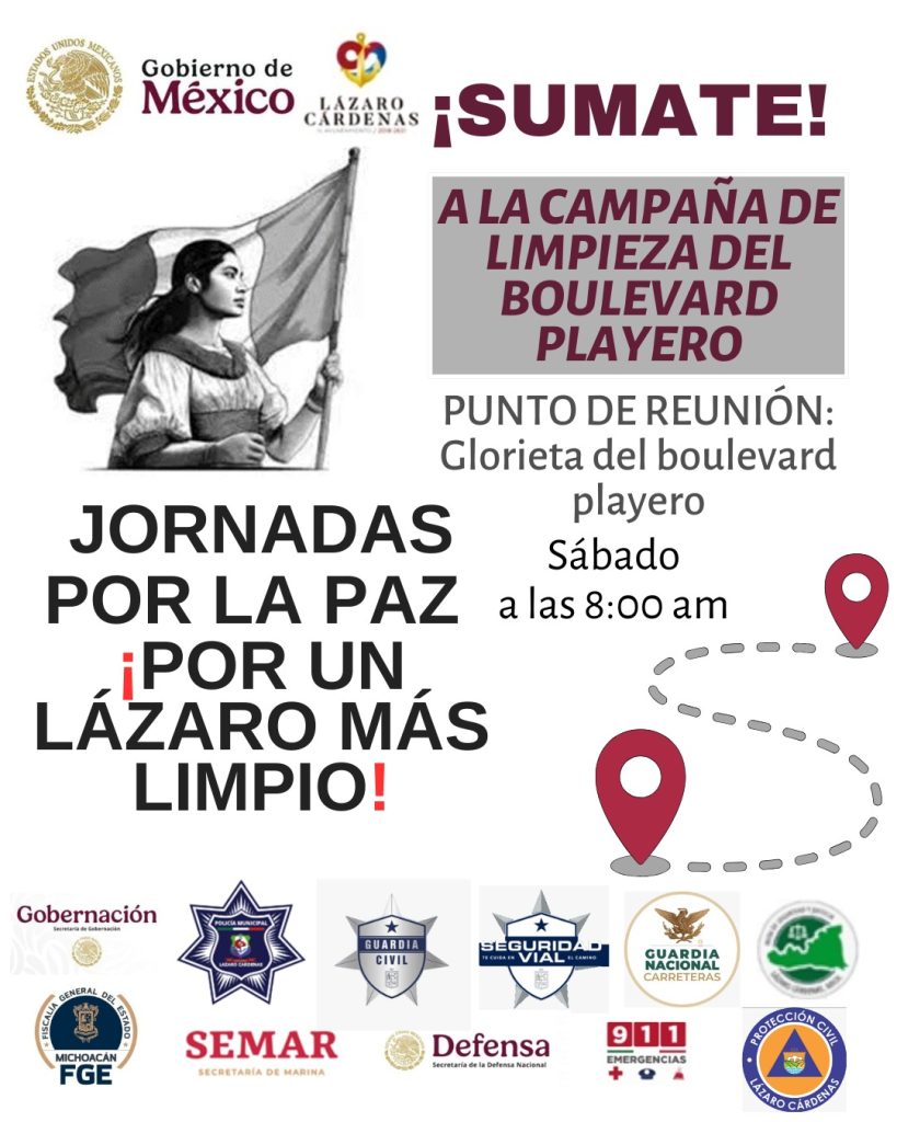 Redacción / La Voz de Michoacán Lázaro Cárdenas, Michoacán. Como parte de las Jornadas por la Paz y por un Lázaro más limpio, este sábado se llevará a cabo una campaña de limpieza en el Boulevard Playero, convocando a toda la ciudadanía a participar en esta acción en beneficio del municipio. El punto de reunión será la Glorieta del Boulevard Playero a las 8:00 a.m., para ello el Gobierno Municipal invita a toda la ciudadanía a sumarse a esta iniciativa, especialmente a asociaciones de deportistas, empresas, instituciones educativas, comerciantes y grupos organizados que deseen contribuir a mejorar la imagen urbana y fortalecer la cultura de limpieza en el puerto. Este esfuerzo cuenta con la colaboración de diversas instituciones como el Gobierno Municipal, la Secretaría de Marina (SEMAR), Guardia Nacional (GN), Secretaría de Gobernación, Guardia Civil, Seguridad Vial, Protección Civil Municipal (PCM), Dirección de Seguridad Pública Municipal (DSPM), Fiscalía General del Estado y la Secretaría de la Defensa Nacional, entre otras dependencias, quienes se suman a la convocatoria para generar conciencia sobre el cuidado del entorno.