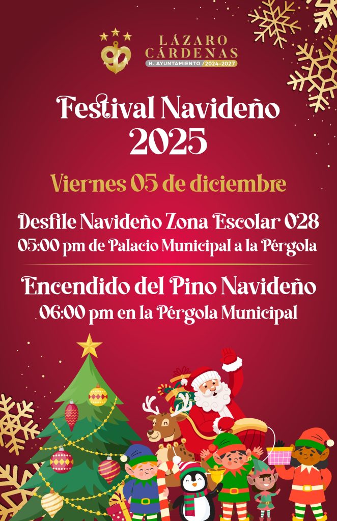 Redacción / La Voz de Michoacán Cd. Lázaro Cárdenas.- El Gobierno Municipal de Lázaro Cárdenas invita a todas las familias a disfrutar del Festival Navideño 2025, un evento lleno de magia, color y tradiciones que marcará el inicio de las celebraciones decembrinas en el municipio. Las actividades darán comienzo este viernes 05 de diciembre con el Desfile Navideño de la Zona Escolar 028, que iniciará a las 05:00 de la tarde desde el Palacio Municipal y avanzará por las principales calles hasta llegar a la Pérgola Municipal. Como acto central de la jornada, a las 06:00 de la tarde se realizará el tradicional Encendido del Pino Navideño en la Pérgola Municipal, con lo que se dará oficialmente la bienvenida a la temporada navideña en un ambiente familiar lleno de música, creatividad y alegría para niñas, niños y adultos. El Gobierno Municipal hace una cordial invitación a la ciudadanía para participar en esta gran celebración y disfrutar de las actividades preparadas para promover la convivencia, el espíritu navideño y la unión comunitaria.