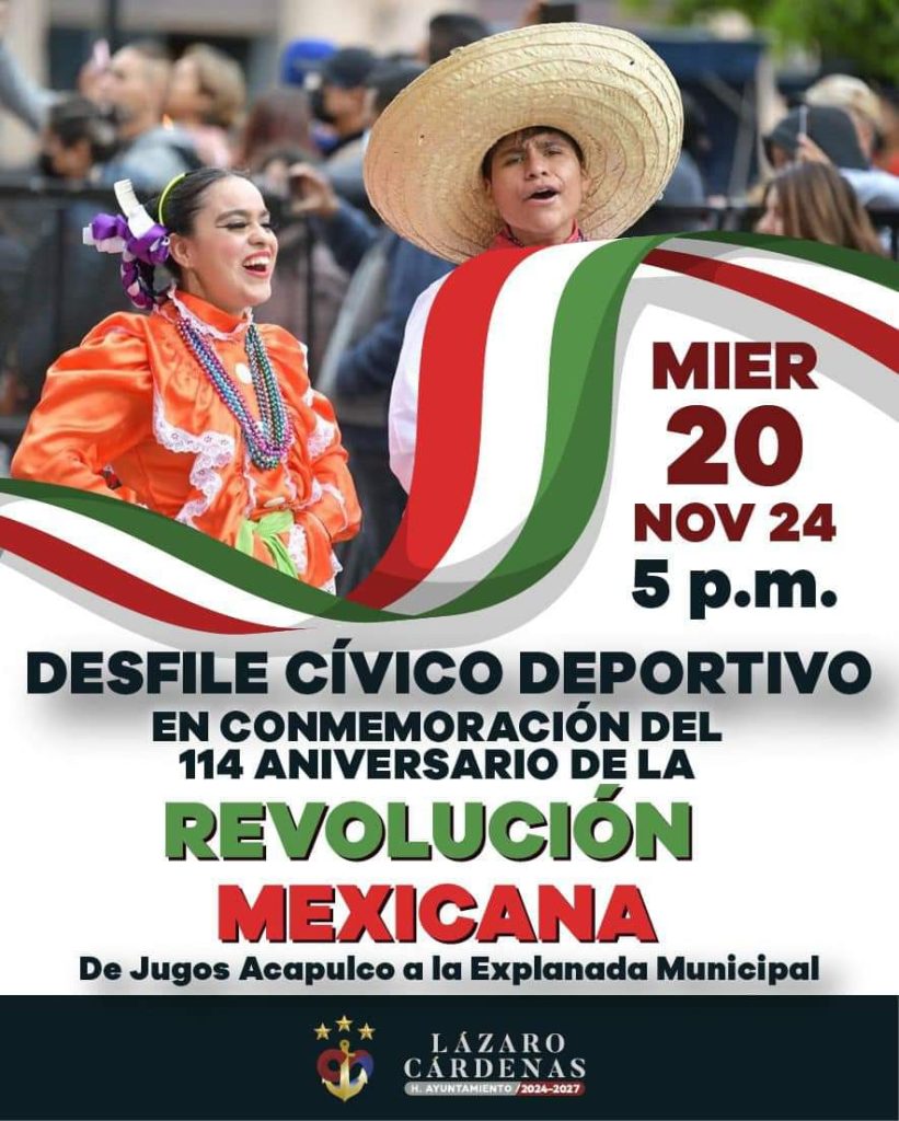 Cd. Lázaro Cárdenas, Mich., a 19 de Noviembre de 2024.- El Gobierno Municipal recuerda a la población en general que este año el Desfile Deportivo-Militar- conmemorativo al CXIV Aniversario de la Revolución Mexicana, se llevará a cabo este miércoles a las 17:00 horas partiendo en su ruta tradicional, iniciando de Jugos Acapulco sobre la avenida Lázaro Cárdenas hasta llegar al Palacio Municipal.