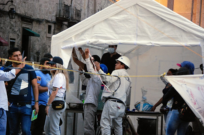 Morelia, Michoacán. Para hacer más cómoda su estancia en el plantón que mantienen en la avenida Madero, este martes fue instalado el servicio de energía eléctrica en las casas de campaña que normalistas colocaron en el centro histórico de Morelia.