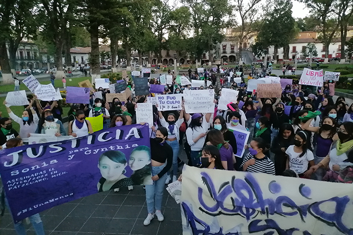 Angélica Ayala / La Voz de Michoacán Pátzcuaro, Michoacán. Con la denuncia pública de mujeres que han sido abusadas sexualmente, desaparecidas, asesinadas, violentadas física, emocional y económicamente, se realizó la marcha con motivo del Día Internacional de la Mujer. La cita fue en la Plaza de San Francisco, donde previamente elaboraron las pancartas con las consignas feministas, iniciaron su recorrido, ante la indiferencia de quienes se encontraban en las calles, los negocios y las plazas públicas. En la Plaza de San Francisco, mientras las jóvenes elaboraban sus pancartas, elementos de la Policía Municipal se apersonaron en el lugar, así como una patrulla con elementos que estaban a la expectativa, pero todo transcurrió con normalidad. Al frente del contingente llevaban una gran lona pidiendo justicia por Cinthia y Sonia, madre e hija que fueron asesinadas a principios de febrero y las investigaciones no han arrojado resultados. Otra manta era para Yuritzi, joven asesinada por su pareja hace poco más de un año, originaria de Santa Clara del Cobre, el responsable está detenido pero aún no enfrenta el juicio. Foto, Angélica Ayala. “¡La que no brinque es macho!”, “¡abajo el patriarcado!”, “¡amiga, hermana aquí está tu manada!”, “¡ni una más, ni una más, ni una asesinada más!”, eran algunas de las consignas que gritaban a todo pulmón, con todas sus fuerzas. Así recorrieron las calles céntricas de la ciudad para llegar nuevamente a la Plaza Vasco de Quiroga, donde se congregaron para emitir su posicionamiento y escuchar a quienes pedían hablar por el parlante. “Hola, soy Paola y quiero decirles que tenía siete años cuando fui abusada sexualmente por un hermano de mi abuelo, no se ha hecho justicia”, “Soy Brenda, y quiero decirles que mi acosador siempre estuvo al lado mío, trabajando, la Policía no hizo nada, a mí no me creyeron”, “Soy Erika y esta es la historia de mi mamá, que aguantó a mi papá por 17 años. Su acoso, sus celos, hasta el último año que huimos de mi pueblo”. Foto, Angélica Ayala. “Soy Pao, mi familia es muy conservadora, el amigo de mi papá nos invitó a su casa y cuando nadie se dio cuenta, su amigo me tocó. Tengo miedo constante de que si no estoy les pase a mis dos hermanas menores”; “quiero decirles que hace nueve años mi hermana Mariana está desaparecida, no sabemos nada de ella”; “Belém Morales no ha tenido justicia, hace dos años de su muerte y aun dando los indicios no ha habido justicia para ella”, Belém era originaria de Tzurumútaro y fue encontrada una semana después de su desaparición muerta a una orilla de la carretera que conduce a Tzintzuntzan. “He sido abusada por un familiar y mi hermano, tuve el valor de hablar con mi papá y me culpaba por mi orientación sexual”; “Me llamo Crishat, fui abusada por familiares por varias ocasiones, mi familia me dio la espalda, me hicieron creer que era culpa mía, quiero decirles que la familia también lastima”, son algunos de los testimonios que las jóvenes que participaron en la marcha denunciaron públicamente y recibieron todo el apoyo de las demás. “No estás sola”, “yo sí te creo”, entre lágrimas cada una narró los abusos sufridos y tras ello recibían el fuerte abrazo de quienes lideraban el evento, abrazos que no terminaban, mientras lloraban. Foto, Angélica Ayala. El posicionamiento del colectivo Hydras e Itsî en específico fue para la Fiscalía General de Michoacán, para que revise y asegure el acceso a la justicia para las víctimas, que persiga a los agresores, “rompa el pacto y haga su trabajo, carajo”. Al presidente municipal de Pátzcuaro, Julio Arriola, le señalaron que no han sido convocadas a reuniones de trabajo para aplicar políticas eficientes y adecuadas, pidieron una policía con perspectiva de género, guarderías para ejercer la maternidad y un refugio para mujeres violentadas.