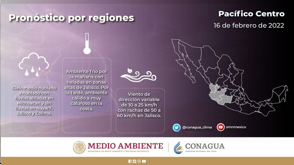 De acuerdo a pronósticos del Servicio Meteorológico Nacional (SMN), se prevé cielo de medio nublado a nublado, posibles chubascos y ambiente frío a muy frío en zonas altas de la entidad. Por la tarde, se prevé ambiente de cálido a muy caluroso en la Costa.