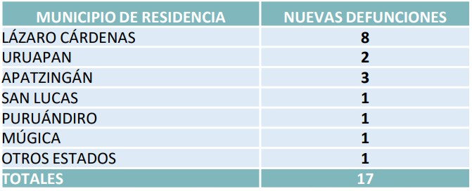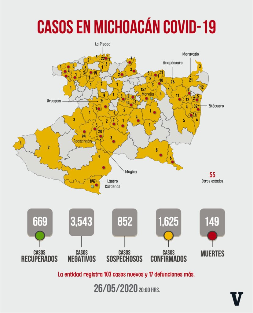 La Voz de Michoacán te presenta todas las noches el último reporte de la Secretaría de Salud de casos de COVID-19 Osiris Olachea / La Voz de Michoacán Confirmados Curados Muertes Michoacán1,625669149Lázaro Cárdenas847.59Morelia157.14Apatzingán94.10Uruapan71.7Zitácuaro32.8México74,560.8,134 Morelia, Michoacán. Este martes Michoacán vivió el día más letal de la epidemia por coronavirus: en las últimas 24 horas 17 personas más murieron a causa de complicaciones por la enfermedad de COVID-19, el número más alto de muertes que se registran al día, y que en total son 149 en el estado, de acuerdo con el reporte del Comité Estatal de Seguridad en Salud (CESS). También este día se reportaron 103 nuevos contagios, más de la mitad de ellos en Lázaro Cárdenas, municipio que a su vez tiene el mayor número de muertes, con 59 en total, 8 de ellas ocurridas en las últimas horas. Fuente: Departamento de Epidemiología de la Secretaría de Salud. Diseño: Enrique Santiago, La Voz de Michoacán. Apatzingán, uno de los municipios con crecimiento acelerado de contagios en los últimos días, registró hoy 9 casos más de COVID-19 y 3 defunciones, con lo que suma 94 personas infectadas en total y 10 muertes. Aunque en Morelia no se notificaron nuevos fallecimientos por la enfermedad causada por el virus SARS-CoV-2, sí sumó 6 contagios y alcanzó los 157 acumulados; es el segundo municipio más afectado durante esta emergencia sanitaria, después del puerto michoacano. Los municipios que registraron un nuevo fallecimiento por coronavirus son San Lucas, Puruándiro y Múgica; además se añade el deceso de una persona que reside en otra entidad, pero que pereció en Michoacán, por lo que se incluye en el corte estatal. De los nuevos contagios reportados este martes, 7 son de habitantes de Uruapan, que llega a 71 infectados, de los cuales 7 han muerto, dos de ellos entre ayer y hoy. Zitácuaro tiene 2 personas más con la enfermedad, 32 casos en total, y de estos 8 han fallecido. Es el cuarto municipio con más muertes. Con un contagio más, Maravatío alcanza los 21 enfermos de COVID-19 y es el octavo municipio con el mayor número de casos, pero todavía sin decesos por este padecimiento. Tuxpan sumó hoy 3 casos y llegó a 12 acumulados, de acuerdo con el informe que emitió hoy el comité encargado de la atención a la epidemia en Michoacán, conformado por autoridades estatales y federales. Los municipios en los que se notificaron 2 contagios más este martes son Múgica (20 en total), Juárez (17 en total), Álvaro Obregón (10 en total) y Jungapeo (4 en total). Mientras que con 1 caso nuevo están los municipios de Zamora (14 totales), Hidalgo (11 totales), Copándaro (8 totales), Charo (5 totales), Angangueo (5 totales), Irimbo (4 totales), Paracho (4 totales), Tarímbaro (3 totales), Puruándiro (3 totales, uno de ellos fallecido) y Buenavista (3 en total). Hasta hoy permanecen hospitalizadas 60 personas en el estado, de las cuales 45 están graves; 54 son atendidos en hospitales públicos y 4 en privados, de acuerdo con las autoridades sanitarias. Se han practicado hasta ahora más de 6 mil pruebas a habitantes de la entidad para detectar si se contagiaron del virus, de las cuales 852 se mantienen como pacientes sospechosos y 3 mil 543 han dado negativo al estudio. El número de personas recuperadas aumentó a 669, 43 más que ayer. Del total de personas infectadas, 972 son hombres, casi 60 por ciento de los pacientes en el estado, y mujeres son 653. Los municipios que registran más defunciones son Lázaro Cárdenas, con 59 casos; Morelia, con 14; Apatzingán, con 10 decesos, Zitácuaro con 8 y Uruapan con 7. Después están Múgica, con 4 fallecimientos, mientras que La Piedad y Huetamo tienen 3 cada uno. Otros 6 municipios reportan 2 muertes por COVID-19 y 17 más solo tienen una defunción, de los cuales Puruándiro y San Lucas registraron hoy dicho fallacimiento. Fuente: Dirección General de Epidemiología. Diseño: Enrique Santiago, La Voz de Michoacán.