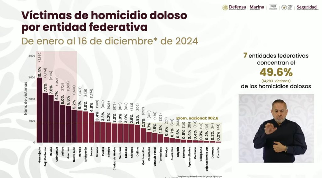 Redacción / La Voz de Michoacán Morelia, Michoacán. En el último informe del año del Gobierno de México sobre seguridad, la entidad michoacana se mantiene en el noveno lugar en la incidencia de homicidios dolosos en el país, al registrar de enero al 16 de diciembre de este año mil 431 casos, de acuerdo con las cifras presentadas este viernes por Marcela Figueroa, titular del Secretariado Ejecutivo del Sistema Nacional de Seguridad Pública (SESNSP). Respecto al anterior informe del SESNSP, dado a conocer el pasado 3 de diciembre y correspondiente al periodo enero-noviembre, Michoacán registra un incremento de 59 asesinatos (1,372/1,431). El estado se mantiene dos lugares fuera de las 7 entidades federativas que concentran el 49.6% (14 mil 283 víctimas) de los homicidios dolosos en el territorio nacional, y por debajo de Morelos, que ocupa la octava posición, con 1,475 casos. De los 7 estados con más homicidios, Guanajuato lidera con la mayor cantidad, con 2 mil 990; le siguen Baja California (2,274), Estado de México (2,185), Chihuahua (1,925), Jalisco (1,721), Guerrero (1,684) y Nuevo León (1,507). En contraparte, los estados que suman menos de 100 homicidios son Yucatán (44), Durango (64), Baja California Sur (72) y Campeche (90).