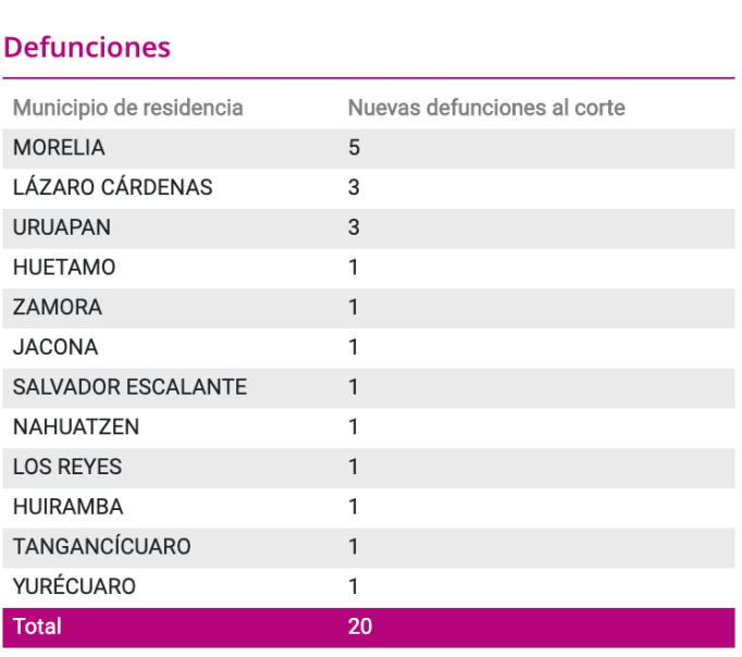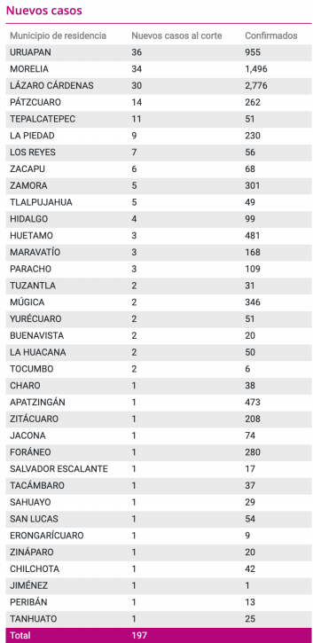 Casos acumulados Confirmados Recuperados Muertes Lázaro Cárdenas2,7762,419142Morelia1,4961,059106Uruapan95572982Huetamo48143131Apatzingán47339539Múgica34628453 La Voz de Michoacán te presenta todas las noches el último reporte de la Secretaría de Salud de casos de COVID-19 Osiris Olachea / La Voz de Michoacán Morelia, Michoacán. Este sábado Michoacán rebasó los 10 mil casos de COVID-19: en las últimas horas registró 197 contagios nuevos, la mayoría en Uruapan, Morelia y Lázaro Cárdenas, de acuerdo con el informe epidemiológico presentado esta noche por el gobierno del estado. En el último día murieron 20 personas más, con las que la entidad llegó a las 766 defunciones de personas por complicaciones de la enfermedad. Hasta hoy 2 mil 263 pacientes han superado la enfermedad de COVID-19 en Michoacán, lo que representa 77 por ciento del total de casos positivos. Aunque la mayoría de las personas que se infectaron con el virus SARS-CoV-2 ya se recuperaron, todavía hay mil 532 personas consideradas casos activos, pues manifestaron síntomas en los últimos 21 días y son quienes pueden transmitir el virus a otras personas; además, en el estado hay otros 2 mil 263 casos sospechosos, es decir, que podrían estar contagiados, pero no se ha confirmado mediante estudios de laboratorio. Uruapan es hoy el municipio en registrar más casos nuevos: sumó 36 y llegó a un total de 955, de los cuales 729 se han recuperado, 144 todavía están enfermos y 82 han fallecido, 3 de ellos en las últimas horas. En la ‘Perla del Cupatitzio hay además 163 casos sospechosos que podrían aumentar la cifra de contagios, de resultar positivos al virus. Morelia registró 34 contagios más en las últimas 24 horas y alcanzó los mil 496 casos acumulados, de los que mil 59 superaron ya el COVID-19, pero 331 todavía están enfermos y batallan con síntomas como dolor de cabeza, fiebre y tos, que son los más comunes. En el último día murieron en la capital michoacana 5 personas más por la enfermedad, y con ellas los decesos llegan a 106 en lo que va de la epidemia. Además, en Morelia hay 628 casos sospechosos, que de ser confirmados positivos, incrementarían en casi el doble los contagios acumulados en el municipio. Lázaro Cárdenas, el municipio más afectado por la epidemia, al concentrar 27.5 por ciento del total de casos en el estado, registró este sábado 30 habitantes más con COVID-19, de los cuales 2 mil 419 se han recuperado, mientras que 215 más todavía están enfermos. En el puerto michoacano han muerto 142 personas por las complicaciones que causa el padecimiento, 3 de ellas en las últimas horas, y 263 habitantes son casos sospechosos. Consulta aquí la información de todos los municipios Pátzcuaro registró 14 contagios más y alcanzó los 262 casos acumulados; de ellos, 126 ya vencieron al COVID-19, pero otros 119 todavía están enfermos y pueden contagiar a otras personas. En este Pueblo Mágico fallecieron 17 personas y otras 50 son sospechosas de tener el virus. Tepalcatepec, que actualmente está en bandera blanca, es decir con riesgo controlado, en este día reportó 11 casos más, 51 en total, de los cuales 16 todavía están enfermos y 35 ya se recuperaron; otros 21 son casos sospechosos.