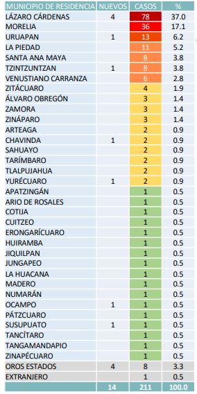 Paola Franco / La Voz de Michoacán Morelia, Michoacán. El estado michoacano ha superado los 200 casos de COVID-19 este día, de acuerdo al reciente informe de la Secretaría de Salud suman 211 las personas contagiadas, mientras que son ya 32 los fallecimientos a causa de este virus. Sin embargo, los casos son acumulados, es decir, en los 211 se contemplan los casos de personas que ya se han curado. Hasta este sábado se tiene el dato de 47 recuperados. Por lo tanto, en la entidad hay 164 personas con el virus activo, de las cuales 28 están hospitalizadas, y de éstas, 17 se encuentran graves. En un día, Michoacán registró 14 nuevos contagios de coronavirus y tres fallecimientos más, puntualizó el Comité de Crisis ante el COVID-19, en el informe que diariamente emite. Lázaro Cárdenas se mantiene como el municipio con más casos, registrando 78 personas contagiadas, de los cuáles cuatro fueron reportados en las últimas 24 horas. Morelia es el segundo municipio con más contagios del virus del SARS-CoV-2, al reportar 36 casos, la misma cantidad que registraba el día de ayer. Y en tercer lugar se ubica Uruapan con 13 casos, uno más con respecto al conteo del día de ayer. En cuarto lugar se encuentra La Piedad, con 11 casos; mientras que Santa Ana Maya y Tzintzuntzan ocupan el quinto lugar, con 8. Venustiano Carranza tiene 6 personas contagiadas, Zitácuaro, 4; Álvaro Obregón, Zamora y Zináparo, registran 3 cada uno; mientras que hay 2 casos en: Tarímbaro, Sahuayo, Tlalpujahua, Yurécuaro, Chavinda y Arteaga. De los 211 casos, 131 son mujeres y 80 hombres, al igual que la tendencia a nivel nacional. La persona más joven en dar positivo al virus es un menor de 2 años y la mayor tiene 88 años. De un total de mil 526 personas a las que se ha estudiado en el estado, 1043 han dado negativo a la prueba, y 272 están como sospechosos en tanto se da el resultado de los estudios. Los fallecimientos por COVID-19 se han registrado en Morelia, Páztcuaro, Tzintzuntzan, Álvaro Obregón, Cuitzeo, Uruapan, La Piedad, Venustiano Carranza, Sahuayo, Lázaro Cárdenas y Arteaga.