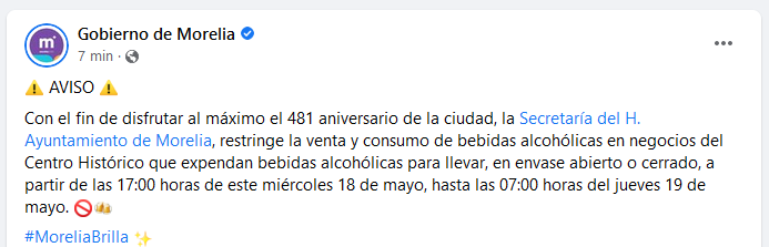 Redacción / La Voz de Michoacán Morelia, Michoacán. Con motivo del 481 aniversario de Morelia, a partir de las 17 horas de este miércoles se restringirá la venta y consumo de bebidas alcohólicas en negocios del centro histórico de la capital michoacana. A través de sus redes sociales, el gobierno de Morelia informa que está restricción va para quienes vendan bebidas para llevar, en envase abierto o cerrados y terminará hasta las 7 de la mañana de este jueves 19 de mayo. La ciudad de Valladolid, hoy Morelia, fue fundada el 18 de mayo de 1541 en el valle de Guayangareo, por disposición del virrey Don Antonio de Mendoza y a instancia de varios españoles avecindados en Michoacán. Se fundó con el propósito de conformar una ciudad capital donde residieran las autoridades civiles y eclesiásticas que hicieran posible la administración y el orden colonial, la cual denominarían Nueva Ciudad de Mechuacan. Morelia ha tenido diversos nombres, en su fundación recibió el nombre de “Mechuacán”, más adelante en 1548 el de Valladolid y en 1848 Morelia, en honor al siervo de la nación, José Ma. Morelos y Pavón. El centro histórico de la ciudad, fue declarado por la UNESCO como “Patrimonio Cultural de la Humanidad”, en diciembre de 1991, por conservar y poseer monumentos históricos y arquitectónicos en su mayoría de la época colonial. Foto: Samuel Herrera. FESTEJO EN GRANDE Un amplio programa de actividades artísticas, gastronómicas y culturales, se harán presentes este miércoles por el aniversario de la fundación de Morelia. Actividades culturales en el Ceconexpo, el Colegio de Morelia y el Museo del Espado para como una función de cine en el parque principal de Villas del Pedregal, a las 19:00 horas, para dar paso a los eventos estelares del día. Por la noche será el encendido especial de Catedral y la presentación de Bronco, en la avenida Madero, a las 20:00 horas. El alcalde Alfonso Martínez Alcázar señaló que será un festejo como nunca antes visto, por lo que instruyó a los titulares de las diversas dependencias municipales competentes a poner todo el empeño en las más de 100 actividades.