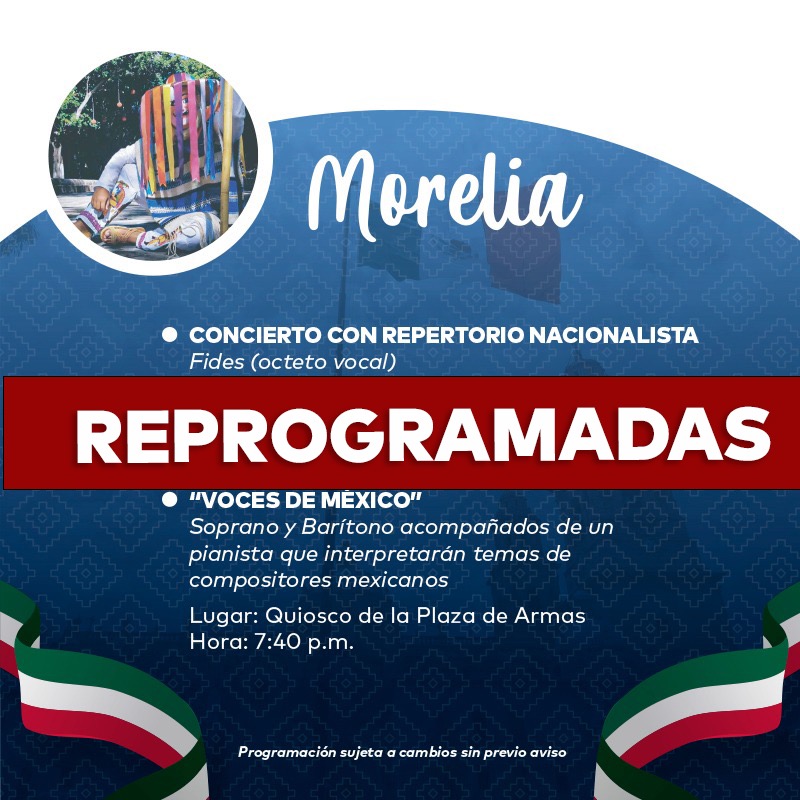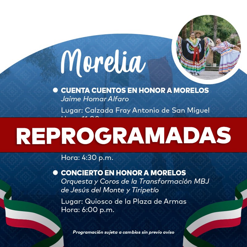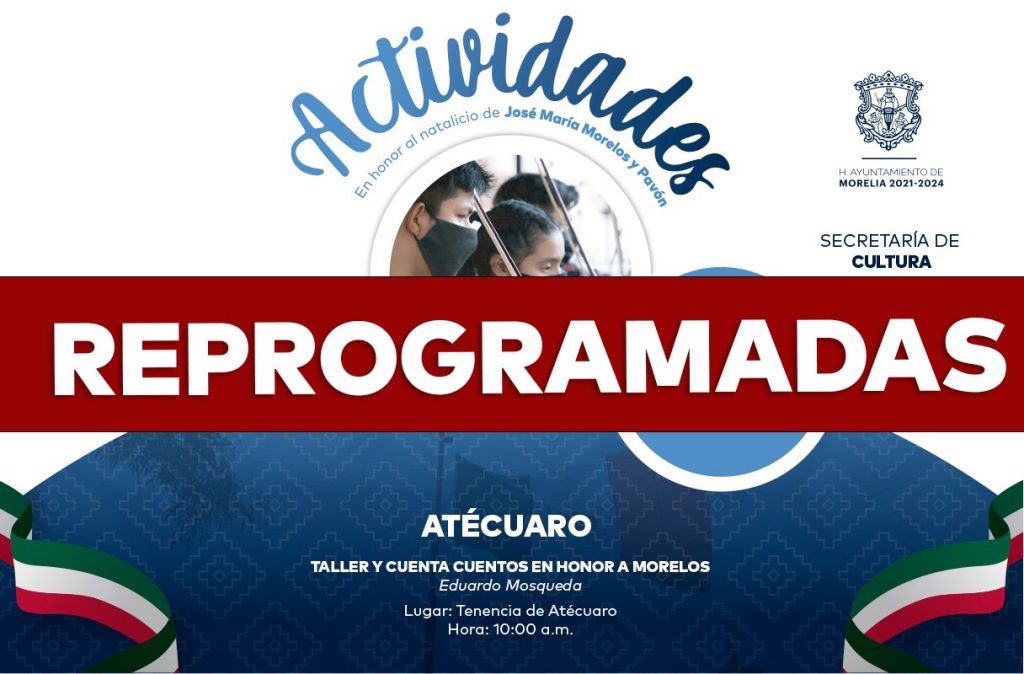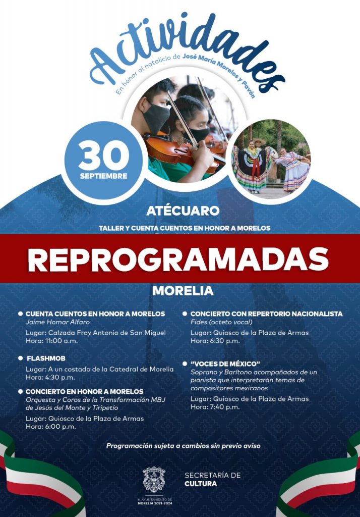 Redacción / La Voz de Michoacán Morelia, Michoacán. En atención a las medidas sanitarias y para salvaguardar la salud de los morelianos, el Ayuntamiento de Morelia informa que las actividades culturales que se tenían programadas el 30 de septiembre para celebrar el natalicio de José María Morelos y Pavón, serán pospuestas. Al respecto, la Secretaría de Cultura de Morelia informó que estas actividades, como el flashmob, cuentacuentos y conciertos, serán reprogramadas y las próximas fechas serán informadas a través de las redes sociales de la dependencia, por Facebook, Instagram y Twitter.