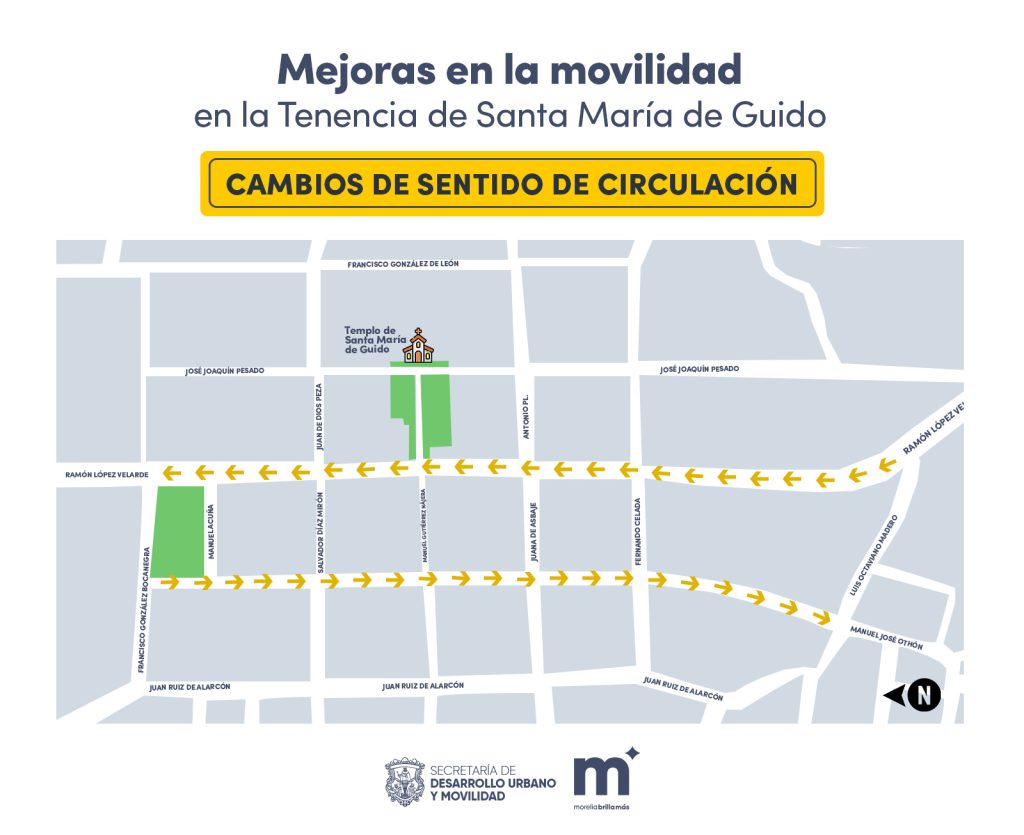 Morelia, Michoacán.- El Gobierno de Morelia, informa la implementación de importantes cambios en el sentido de las calles en la Tenencia de Santa María de Guido, con el objetivo de optimizar el flujo vehicular y mejorar la seguridad vial para todas y todos los usuarios. A partir del lunes 23 de diciembre, iniciarán los trabajos de balizamiento por parte de CEBRAS de la Secretaría de Desarrollo Urbano y Movilidad, en colaboración con Policía Morelia, quienes estarán presentes para garantizar la seguridad vial y evitar incidentes durante el proceso. Además, el personal de Policía Morelia orientará a los usuarios sobre los cambios que se realizarán en la zona, asegurando una transición ordenada. El cambio en el sentido de circulación será en la calle Ramón López Velarde, que pasará a ser de un solo sentido, permitiendo el tránsito vehicular de Sur a Norte, lo que agilizará el flujo de vehículos y reducirá los cuellos de botella. Quienes transiten en el sentido Norte a Sur, lo podrán hacer por la calle Manuel José Othón que mantendrá su dirección de circulación actual, sin cambios. Con estas modificaciones, se prevé una circulación más fluida y segura, especialmente durante las horas pico. El cambio a un solo sentido en la calle Ramón López Velarde también contribuirá a una mejor organización del tránsito pesado y el transporte público. Los camiones de carga y autobuses tendrán rutas más definidas, evitando la necesidad de maniobrar en doble sentido en calles angostas, lo que reducirá retrasos y minimizará los riesgos de accidentes. Además, este cambio permitirá la implementación de medidas de seguridad en las zonas escolares. Al eliminar la circulación en doble sentido, se podrán establecer zonas de ascenso y descenso seguras frente a las escuelas 20 de Noviembre y el Colegio Santa María de Guido. Con la reducción de vehículos en doble sentido, se disminuirán también los puntos de riesgo para los peatones, especialmente en las áreas cercanas a las instituciones educativas. Esta mejora en la seguridad vial beneficiará a estudiantes, padres, madres y vecinos de la zona. Los cambios también tendrán un impacto positivo en el transporte público, con rutas de camiones y combis como Santa María, El Durazno, Jesús del Monte, así como las combis Naranja 3 y Oro Verde, que verán trayectos más rápidos y ordenados. Estas acciones son parte de un compromiso continuo para mejorar la movilidad y la seguridad vial en Morelia, brindando una mejor calidad de vida para todos los morelianos.