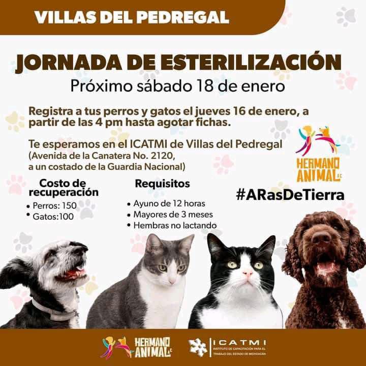 Redacción / La Voz de Michoacán Morelia, Michoacán. Con el objetivo de combatir el abandono y el maltrato de perros y gatos, la asociación Hermano Animal llevará a cabo su primera feria de esterilización del año, este sábado 18 de enero en el Instituto de Capacitación para el Trabajo de Michoacán (ICATMI), en la avenida De la Cantera número 2120, junto al cuartel de la Guardia Nacional, al poniente de Morelia. El registro ya está disponible para quienes deseen esterilizar a sus seres de compañía. Los requisitos incluyen que los animales tengan más de tres meses de edad, que las hembras no estén lactando y un ayuno previo de 12 horas. Los costos son accesibles: 150 pesos para perros y 100 pesos para gatos. La asociación hace un llamado urgente a la sociedad para asistir a esta jornada, al señalar que la esterilización es clave para reducir el número de animales en situación de calle y mejorar su calidad de vida. La campaña busca sensibilizar a la población sobre la importancia de actuar de forma responsable para frenar el abandono masivo de animales, quienes también son seres sintientes.