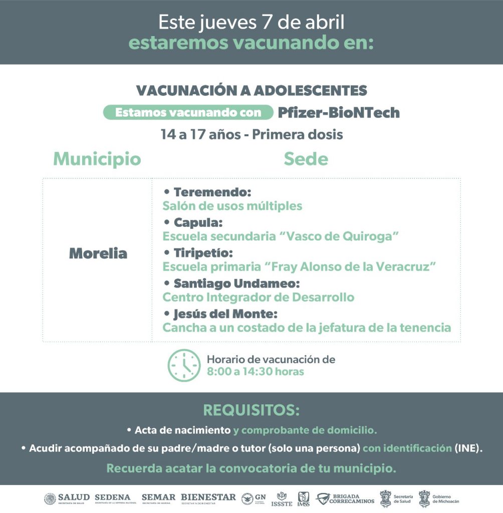 Redacción / La Voz de Michoacán Morelia, Michoacán. Este jueves 7 de abril, la Secretaría de Salud de Michoacán (SSM) aplicará primeras dosis de la vacuna anti COVID-19 a menores de 14 a 17 años, en cuatro tenencias de Morelia. El primer módulo estará ubicado en el Salón de Usos Múltiples de la tenencia de Teremendo, el segundo en la Escuela Secundaria Vasco de Quiroga de Capula, uno más en el Centro Integrador de Desarrollo de Santiago Undameo y el cuarto en la cancha ubicada a un costado de la jefatura de tenencia de Jesús del Monte. El horario de atención de estos cuatro módulos será de 8:00 a 14:30 horas, y los padres o tutores de los menores que se van a vacunar, deberán llevar acta de nacimiento del adolescente, CURP y comprobante del domicilio del infante, así como el formato de vacunación impreso y prellenado, el cual puede descargarse de https://mivacuna.salud.gob.mx/index.php. La jornada de vacunación está enfocada únicamente para los menores que radiquen en las tenencias mencionadas y el biológico que se aplicará será el Pfizer-BioNTech. Si ya cumpliste 14 años, y no puedes descargar tu Expediente, ingresa a: https://www.michoacan.gob.mx/wp-content/uploads/2021/12/EXPEDIENTE-DE-VACUNACION.pdf APLICARÁN REFUERZO EN MUNICIPIOS Este jueves 7 de abril se aplicará el refuerzo de la vacuna contra COVID-19 a mayores de 18 años en adelante en los municipios de: Panindícuaro 7 de abrilTuricato 7 de abrilLa Piedad 7 y 8 de abril Zináparo 7 y 8 de abril Lázaro Cárdenas 7 y 8 de abril Se aplicará una única dosis de AstraZeneca y es necesario que hayan transcurrido más de 4 meses de la última aplicación. Se debe hacer el registro en https://mivacuna.salud.gob.mx/index.php y se debe presentar INE o identificación oficial, certificado de vacunación o comprobante de segunda dosis y el formato de refuerzo prellenado. REFUERZO 18 A 29 AÑOS Además, este 7 y 8 de abril se aplicará la vacuna de refuerzo a jóvenes de 18 a 29 años en los municipios de Contepec, Epitacio Huerta, Senguio y Tlalpujahua. Será una única dosis con AstraZeneca y es necesario que hayan transcurrido más de 4 meses de la última aplicación. SEGUNDA DOSIS 12-14 AÑOS CON COMORBILIDADES Este jueves 7 de abril se aplicará la segunda dosis de la vacuna anticovid a adolescentes de 12 a 14 años que presenten alguna comorbilidad, en Morelia. Se aplicará una dosis de Pfizer en el Hospital Infntil Eva Sámano de López Mateos, en Ciudad Salud, y es necesario llevar certificado médico, acta de nacimiento y formato de la plataforma. Las comobilidades que se toman en cuenta son las siguientes: