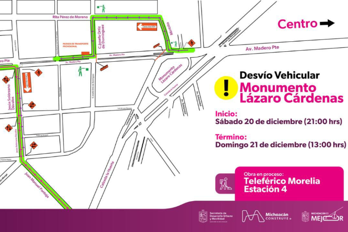 Redacción / La Voz de Michoacán Morelia, Michoacán. - La secretaria de Desarrollo Urbano y Movilidad, Gladyz Butanda Macías, informó que, por obras del teleférico de Morelia, la circulación vehicular en el monumento a Lázaro Cárdenas se ajustará este sábado 20 de diciembre a partir de las 21:00 horas y será normalizada el domingo 21 de diciembre a las 13:00 horas. La funcionaria estatal precisó que los automotores que viajen sobre avenida Madero Poniente, de la Catedral de Morelia al obelisco, deberán desviar su circulación en la calle Mintzita y continuar por Rita Pérez de Moreno para reincorporarse a la Madero por Josefa Ortiz de Domínguez. Si la circulación es opuesta, es decir, del obelisco a catedral, la desviación será en la calle Jesús Solórzano Dávalos y se prolongará hasta Juan Manuel Pantoja. “La desviación vehicular se realizará principalmente por la noche para no entorpecer el tránsito vehicular en horas pico y el domingo a partir de las 13:00 horas la circulación se normalizará, las afectaciones serán mínimas, por lo que apelamos a la comprensión y la paciencia de la ciudadanía capitalina”, agregó. Este ajuste vial se debe a que durante el fin de semana se llevará a cabo la instalación de la torre 19 del Teleférico de Morelia en la zona del monumento a Lázaro Cárdenas.