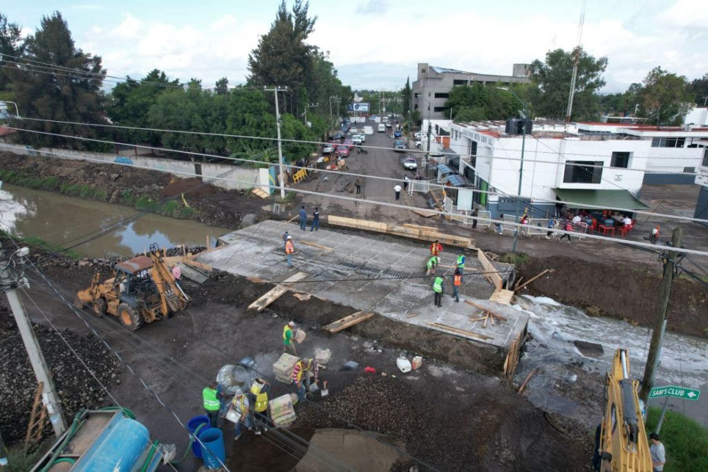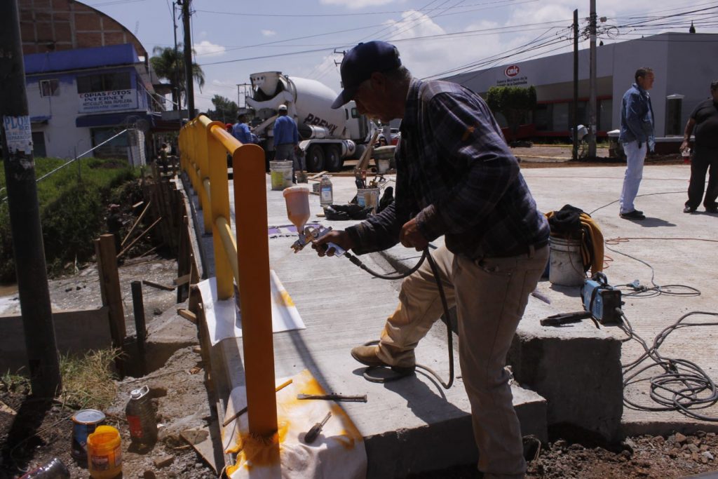 Redacción / La Voz de Michoacán Morelia, Michoacán. A una semana de que se cayera una parte del puente vehicular sobre el dren Barajas en la capital michoacana, este lunes se estaría entregando la obra ya terminada. Durante este día, trabajadores continúan con las obras de detallado, misma que se realizó de manera ininterrumpida, día y noche, y pese a las lluvias. Video: Víctor Ramírez Foto: Víctor Ramírez Foto: Víctor Ramírez Foto: Víctor Ramírez Foto: Víctor Ramírez Alfonso Martínez, alcalde de Morelia, informó que el puente colapsado se sustituyó por uno que contiene 6 tubos de un diámetro de metro y medio cada uno, por donde fluirá el agua del dren, y una estructura de acero armado y placa de concreto. De acuerdo con el alcalde, el nuevo puente tiene el doble de diámetro que tenía el anterior, de tal forma que se resolverá el conflicto del flujo de agua. Desde que se dio a conocer que un vehículo compacto había caído en una parte del puente derrumbado, autoridades municipales empezaron a trabajar en las obras de reparación de la vialidad que es muy transitada. El viernes fue colocado el colado en la obra, en un tiempo aproximado de 5 horas, y posteriormente se esperó el fraguado del concreto. El jueves se terminó de colocar la tubería que consta de 5 tubos con un diámetro de 1.50; este viernes se trabaja en la parrilla que va a soportar el tránsito vehicular.