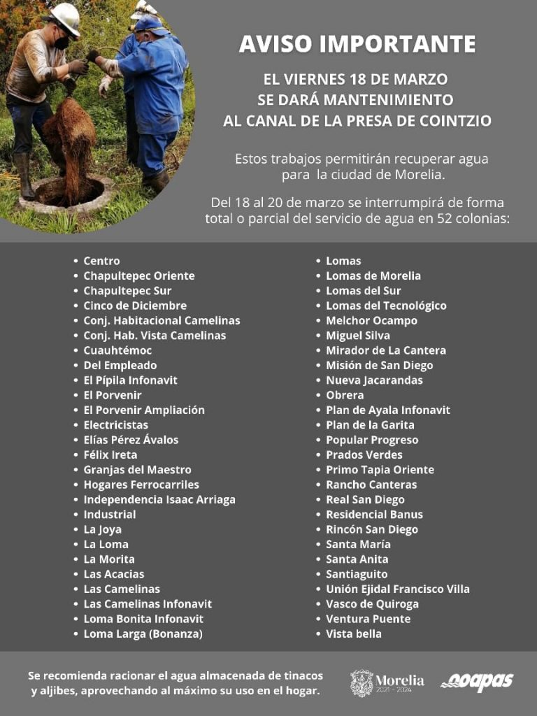 Redacción / La Voz de Michoacán Morelia, Michoacán. Este viernes 18 de marzo, personal del Organismo Operador de Agua Potable, Alcantarillado y Saneamiento de Morelia (OOAPAS) dará mantenimiento al canal que conduce agua desde la presa de Cointzio hasta la Planta Potabilizadora Vista Bella, una de las instalaciones más importantes de abastecimiento para la ciudad de Morelia. La actividad consistirá en el retiro de raíces y material azolvado al interior del canal, lo cual ha reducido la capacidad hidráulica de la infraestructura. La jornada de trabajos se llevará a cabo de 8:00 a 14:00 horas, tiempo durante el cual se retirará de forma manual todo el material acumulado al interior de la infraestructura, principalmente raíces y arcilla acumuladas a lo largo de los 13.6 kilómetros de longitud del canal. Al respecto informa el OOAPAS que para poder realizar esta labor, la Planta Potabilizadora de Vista Bella, ubicada en Santa María, dejará de recibir agua de la presa durante el lapso de tiempo señalado, por lo que 52 colonias de la ciudad presentarán interrupción parcial o total en el servicio de agua durante tres días a partir de la fecha indicada. Una vez terminada la actividad de limpieza, se abrirá nuevamente la válvula de la Presa de Cointzio para hacer llegar agua a la Planta Potabilizadora e iniciar de inmediato el llenado de los tanques que distribuyen agua a la ciudad. La normalización del servicio en la red de distribución tomará de uno a tres días, debido a que tendrán que llenarse de nuevo las tuberías y normalizar la presión. Por lo anterior se pide a la ciudadanía tomar medidas preventivas, almacenando agua desde ahora y aprovechando al máximo su uso en el hogar. Cabe resaltar que estos trabajos de limpieza se programan cada año debido a que el agua proveniente de la presa arrastra material que va saturando el canal, reduciendo poco a poco su capacidad y dificultando el recorrido del agua hacia la planta donde se realiza el proceso de potabilización para garantizar la calidad del agua que se entrega a los hogares morelianos. Se prevé que a partir del lunes 21 de marzo quede normalizado el servicio.“En apego a las acciones preventivas implementadas por la Administración Municipal, en razón de las disposiciones emitidas por las autoridades electorales, este contenido será modificado temporalmente y tiene fines informativos, en atención a las medidas legales y normativas en la materia”.