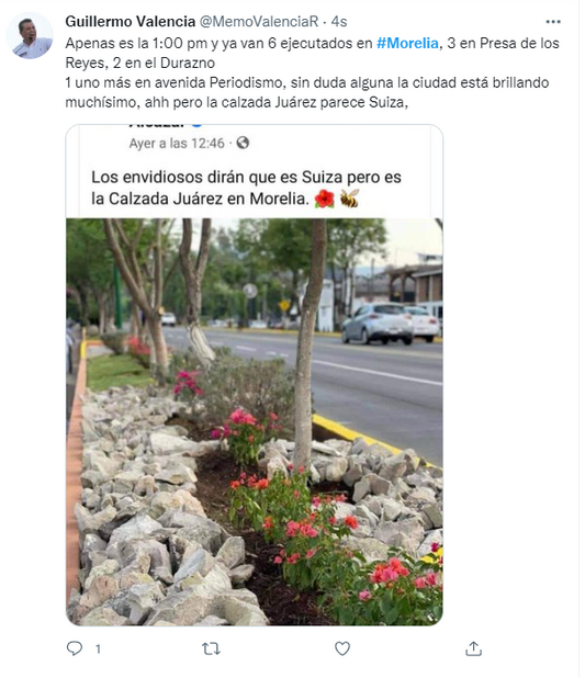 Redacción / La Voz de Michoacán Morelia, Michoacán. Tras la ola de homicidios que se han registrado este miércoles en la capital michoacana, con saldo de 6 personas ejecutadas en distintos hechos, el actual dirigente estatal del PRI, Guillermo Valencia, se pronunció al respecto y tronó contra una publicación del alcalde de Morelia. Valencia hizo alusión a una imagen publicada en días pasados por Alfonso Martínez, en la cual presumía arreglos en camellones y en la cual mencionaba que los envidiosos dirán que es Suiza pero es la Calzada Juárez de Morelia. A lo anterior, el dirigente estatal del PRI mencionó que apenas era la 1 de la tarde y ya van 6 ejecutados en Morelia, 3 en Presa de Los Reyes, 2 en el Durazno y uno más en avenida Periodismo, sin duda alguna la ciudad está brillando muchísimo, "ahh pero la Calzada Juárez parece Suiza".