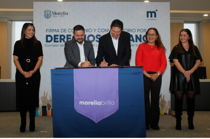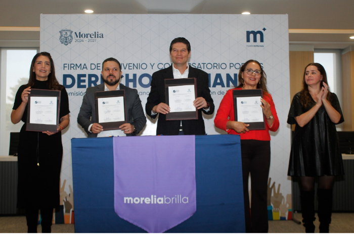 Monserrat Cervantes / La Voz de Michoacán Morelia, Michoacán. – En el marco del Día Internacional de los Derechos Humanos, el Ayuntamiento de Morelia llevó a cabo la firma de un convenio de colaboración con la Comisión Estatal de los Derechos Humanos de Michoacán (CEDH), con el propósito de fortalecer la coordinación institucional, capacitación y protección de los derechos de las y los morelianos. Durante el evento realizado en Palacio Municipal, la síndica Susana Melissa Vázquez Pérez dio la bienvenida a autoridades estatales y municipales, así como a representantes de organizaciones civiles, sindicatos y medios de comunicación. En su mensaje, resaltó que, gracias al trabajo conjunto, Morelia se convirtió en el primer municipio del estado en contar con un protocolo de actuación para servidoras y servidores públicos con perspectiva de derechos humanos. “Refrendamos nuestro compromiso de impulsar acciones de defensa, investigación, vigilancia y promoción de los derechos humanos, siempre en beneficio de la ciudadanía”, señaló. Por su parte, el presidente de la CEDH, Josué Alfonso Mejía Pineda, reconoció la disposición del Ayuntamiento para continuar sumando esfuerzos en favor de una visión garantista desde la administración pública. Recordó que uno de los retos actuales sigue siendo la confianza ciudadana, por lo que la Comisión, dijo, apuesta a un trabajo cercano a las víctimas y activo en territorio. “Un defensor de derechos humanos no se queda en un escritorio; sale, acompaña y no abandona”, afirmó. En su intervención, el presidente municipal Alfonso Martínez Alcázar destacó que Morelia mantiene una política permanente de respeto a los derechos humanos, especialmente en temas de seguridad, como el uso obligatorio de cámaras corporales en la Policía Municipal. Explicó que estas herramientas permiten garantizar transparencia y prevenir abusos de autoridad durante las intervenciones. Martínez Alcázar reiteró que esta administración considera indispensable la existencia de instituciones que supervisen el actuar gubernamental y protejan a la ciudadanía, especialmente en casos donde su integridad pueda verse vulnerada. Foto: Samuel Herrera JR
