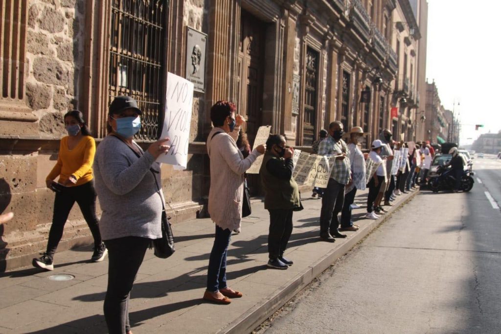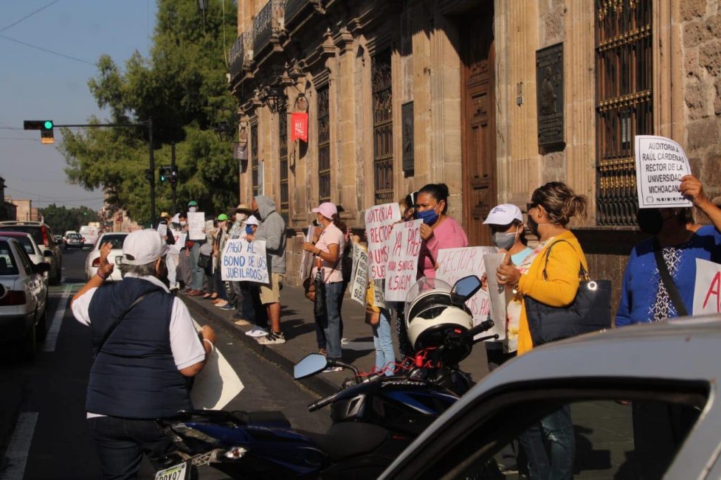 Juan Bustos / La Voz de Michoacán Morelia, Michoacán. Bajo la demanda de exigir una auditoría al rector y el pago de las prestaciones denominadas, integrantes el Sindicato Único de la Universidad Michoacana (SUEUM) se manifiestan en las afueras del colegio de San Nicolás. Foto: Víctor Ramírez. El dirigente Eduardo Tena Flores ha señalado que es injusto que, en la actual administración Universitaria, se continúa reteniendo los salarios de los socios del SUEUM bajo el argumento de que no está actualizado el padrón. El líder señaló que la Universidad tiene la información de quién es un trabajador activo y perteneciente a tal o cual gremio por lo que incluso ha pedido que se pague directamente a los trabajadores la prestación ya que la falta de pago de la misma ha afectado los bolsillos de los trabajadores. Foto: Víctor Ramírez. Los trabajadores permanecen a las afueras del colegio sin interrumpir el tráfico como protesta en el marco del aniversario de la Universidad Michoacana.