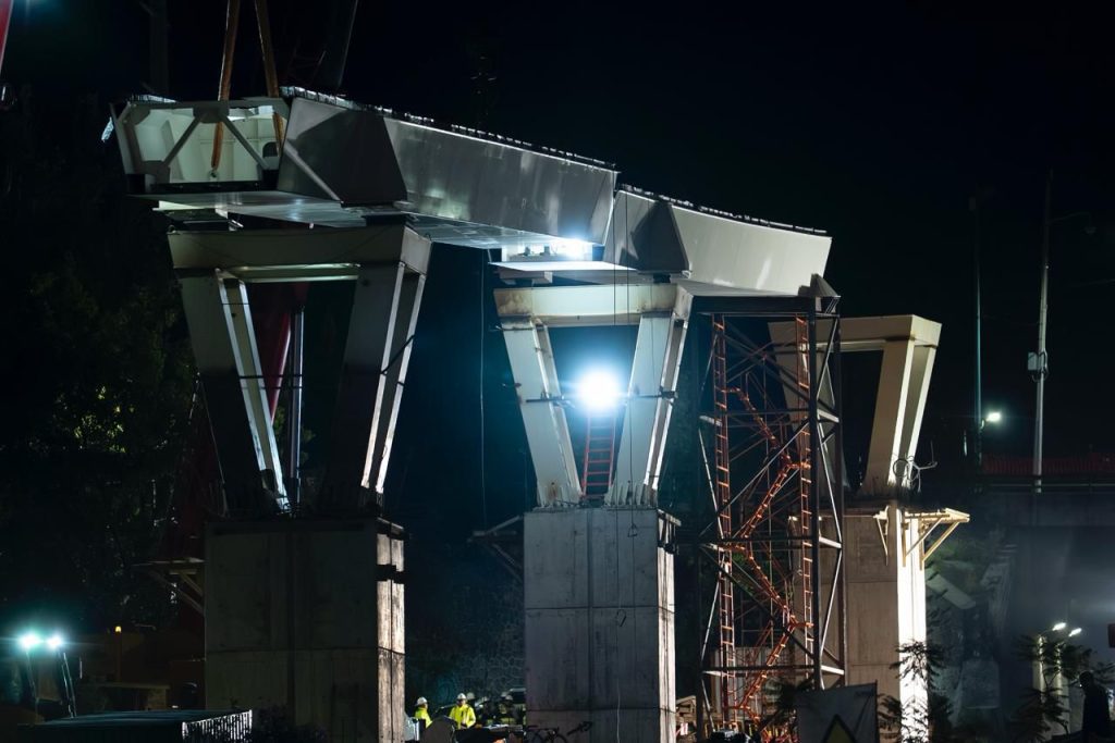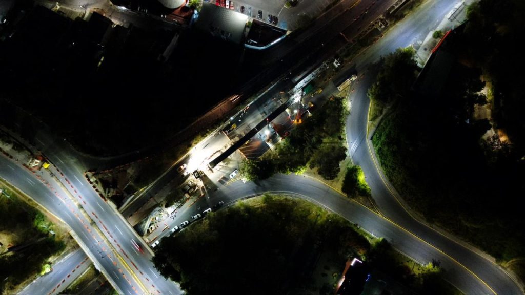 Morelia, Michoacán. - El gobernador Alfredo Ramírez y el secretario de Comunicaciones y Obras Públicas, Rogelio Zarazúa Sánchez, supervisaron la instalación de la segunda trabe de nueve en total que integrarán el puente Periférico-Calzada La Huerta, del distribuidor vial de la salida a Pátzcuaro. El mandatario detalló que la obra, que presenta un avance del 65 por ciento, beneficiará a 197 mil habitantes de la capital michoacana; la proyección es que sea concluida durante los primeros meses del próximo año. Explicó que en Morelia y otros puntos de la entidad también se construyen obras de alto nivel, como es el caso del Paso Eréndira, distribuidor vial ubicado en las inmediaciones del Mercado de Abastos y el segundo anillo periférico, así como el paso elevado de La Hielera, en Uruapan. Mientras que, Zarazúa Sánchez refirió que algunos de los bloques metálicos, que miden hasta más de 40 metros, serán colocados cada cinco días, como parte de los trabajos estructurales. Informó que el montaje de las trabes se realiza de noche para evitar tráfico en la zona, por donde transitan alrededor de 79 mil vehículos al día.