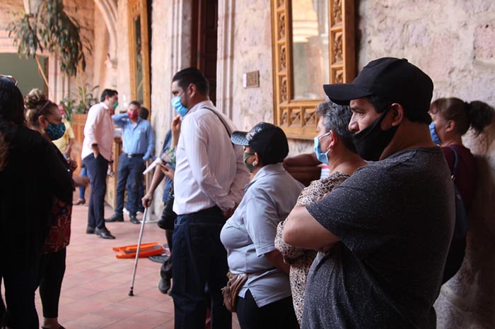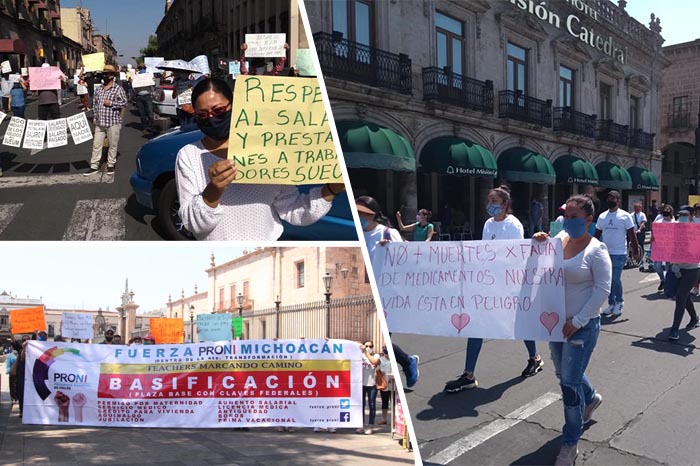 Redacción / La Voz de Michoacán Morelia, Michoacán. En plena fase tres de contingencia por el COVID-19, 4 manifestaciones ahogan este jueves el primer cuadro de la capital michoacana, para exigir apoyos económicos y medicamentos para personas con cáncer. Video: Sam Herrera Jr. El primero de los bloqueos se encuentra sobre la Avenida Madero, a la altura del Hotel Virrey de Mendoza, donde agremiados al Sindicato Único de Empleados de la Univesidad Michoacana (SUEUM) exigen el pago de salarios atrasados, bonos y aguinaldos que no fueron pagados. Video: Arturo Molina. Asimismo, padres de familia, quienes salieron desde el Hospital Infantil, marcharon por Acueducto hasta Palacio de Gobierno para pedir a las autoridades de salud no dejen a sus pequeños que sufren cáncer sin su medicamento. También, maestros de inglés se manifiestan sobre la Plaza de Armas para exigir la basificación de maestros, así como diversos apoyos, entre ellos permiso por maternidad, servicio médico, crédito para vivienda, aguinaldo, jubilación, aumento salarial, entre otros. Por su parte, locatarios de plaza San Francisco se encuentran en el Ayuntamiento para, también, exigir apoyos económicos. Foto: Víctor Ramírez.