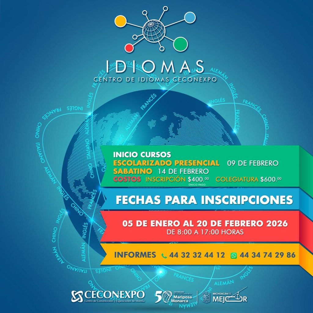 Morelia, Michoacán. - El Centro de Convenciones y Exposiciones de Morelia (Ceconexpo), a través de su Centro de Idiomas, inició el proceso de inscripciones para el ciclo 2026, con una oferta académica que incluye inglés, francés, alemán, italiano y chino para niñas, niños, adolescentes y adultos en niveles de principiantes, intermedios y avanzados.