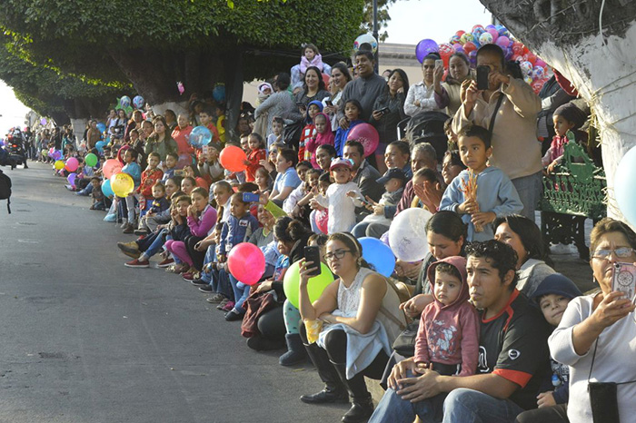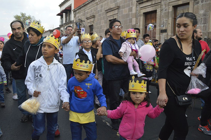 Miles de niños y sus papás aguardan ansiosos al pie de la Catedral de Morelia, para la llegada de la Cabalgata de Reyes Magos, que está a unos minutos de arribar y la cual partió del Santuario de la Virgen de Guadalupe, continúa por la avenida Acueducto, la Av. Madero y posteriormente se detendrá en este sitio emblemático de la ciudad.