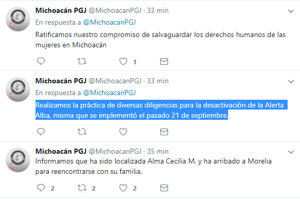 Redacción web / La Voz de Michoacán Morelia, Michoacán. Alma Cecilia Meza Pérez, la estudiante nicolaita de 18 años que estaba desaparecida desde hace casi un mes, fue localizada por elementos de la Procuraduría General de Justicia del Estado. A través de su cuenta de twitter, la procuraduría informó que la estudiante arribó a Morelia para reencontrarse con su familia. Tras lo anterior, se realizó la práctica de diversas diligencias para la desactivación de la Alerta Alba, misma que se implementó el pasado 21 de septiembre.