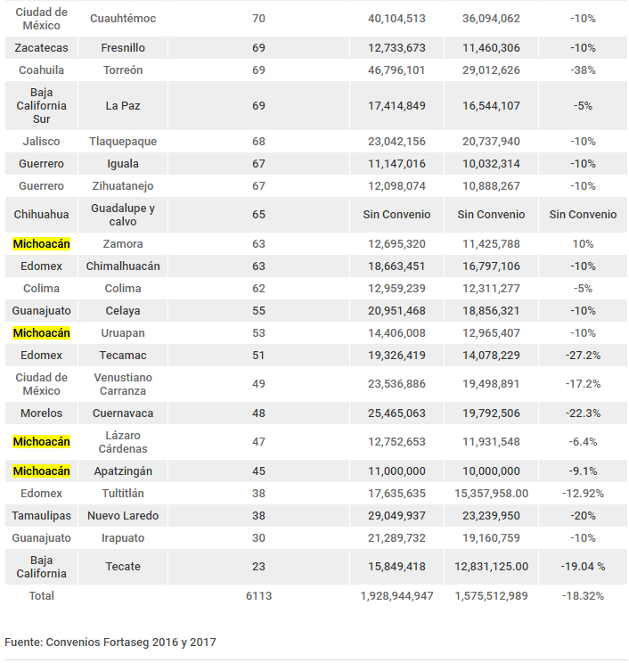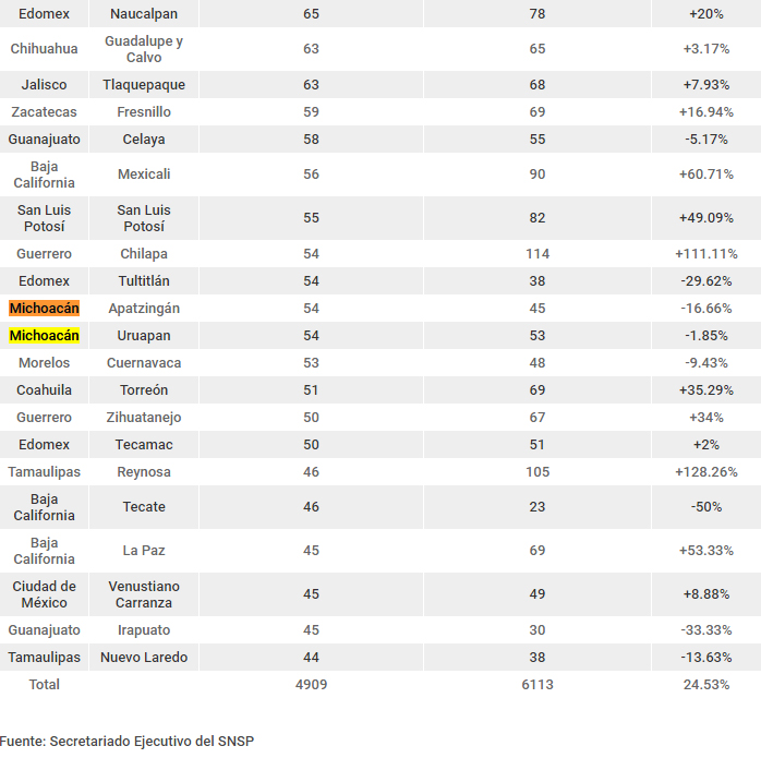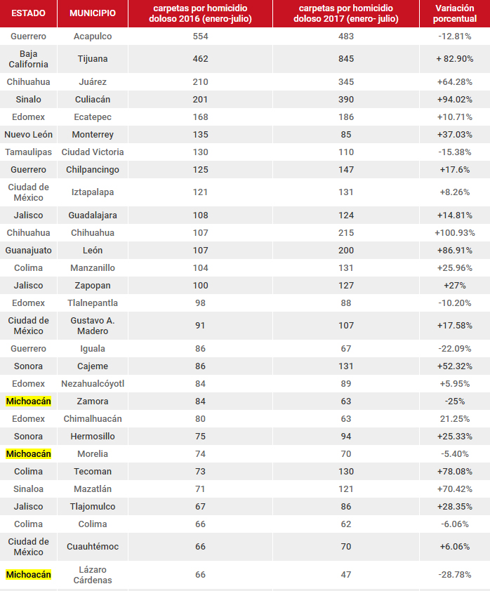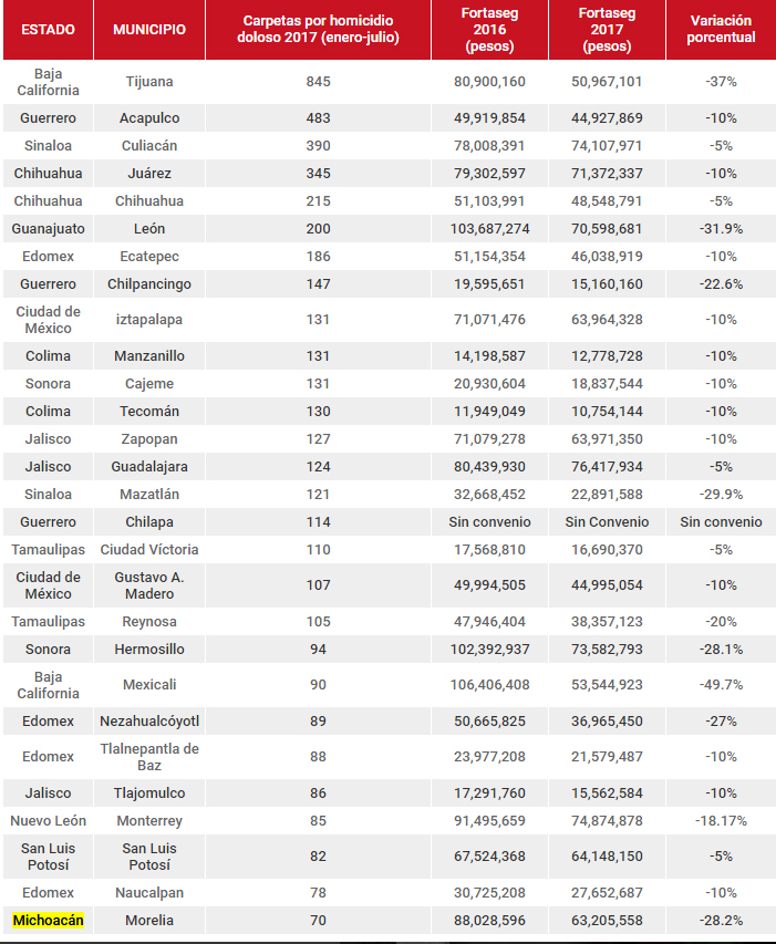 Redacción/La Voz de Michoacán Morelia, Michoacán. Zamora, Morelia, Lázaro Cárdenas, Apatzingán y Uruapan se encuentran entre los 50 municipios nacionales con más homicidios dolos, con el puesto 20, 23, 29,39 y 40 respectivamente, según una investigación de Sin Embargo. A un año de la puesta en marcha de un plan nacional del presidente Enrique Peña Nieto para priorizar los 50 municipios con más homicidios dolosos del país, se evidencia que el plan es un fracaso, señala la investigación, pues las cifras de incidencia delictiva colocan a esos municipios como los que tuvieron más homicidios, en los primeros siete meses de 2016. Los 50 municipios con más homicidios dolosos Así mismo, señala que contrario a los índices de homicidio, los 50 municipios sufrieron una reducción en sus presupuestos para la seguridad. Aportaciones del Programa de Fortalecimiento para la Seguridad (FORTASEG) a los 50 municipios con más homicidios Con las más recientes cifras del Secretariado Ejecutivo del Sistema Nacional de Seguridad Pública se constata que los mismos 50 municipios sumaron 6 mil 113 carpetas de investigación.