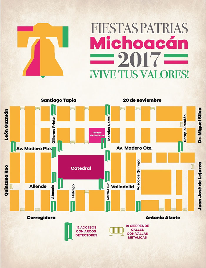 Redacción web / La Voz de Michoacán Morelia, Michoacán, a 12 de septiembre del 2017. Con el objetivo de garantizar la seguridad y el orden público durante las fiestas patrias, la Secretaría de Seguridad Pública (SSP) detalla el dispositivo vial y de acceso que implementará del 14 al 16 de septiembre con la instalación de vallas metálicas y arcos detectores en el primer cuadro de la capital michoacana. El dispositivo, instruido por el titular de la SSP, Juan Bernardo Corona Martínez, contempla cortes a la circulación que iniciarán el próximo jueves 14 de septiembre a partir de las 22:00 horas con el retiro de vehículos y la colocación de 19 vallas y la instalación de 12 arcos detectores. Con apoyo de la Dirección de Tránsito y Movilidad del Estado, los cierres a la circulación comprenderán desde la avenida Madero Oriente y Poniente en sus cruces con Guillermo Prieto, Morelos Norte y Sur, Serapio Rendón, León Guzmán, Vasco de Quiroga, Hidalgo, Allende, Quintana Roo, Abasolo, Dr. Miguel Silva, Santiago Tapia, Valladolid, 20de Noviembre, Juan José de Lejarza, Antonio Alzate y Corregidora. Asimismo, para el día 16 de septiembre, con motivo del desfile cívico militar, serán instalados 20 arcos detectores y serán cerradas calles con 43 vallas. Por ello, se recomienda tomar rutas alternas a los cortes a la circulación vial, y así agilizar el flujo vehicular en la ciudad. El despliegue operativo contará con presencia policial de la Unidad de Restablecimiento del Orden Público (UROP) para realizar actividades de proximidad social. Asimismo, personal de la Policía Michoacán realiza patrullajes permanentes en vehículos y motocicletas para mantener el operativo de vigilancia en el segundo anillo de la ciudad.